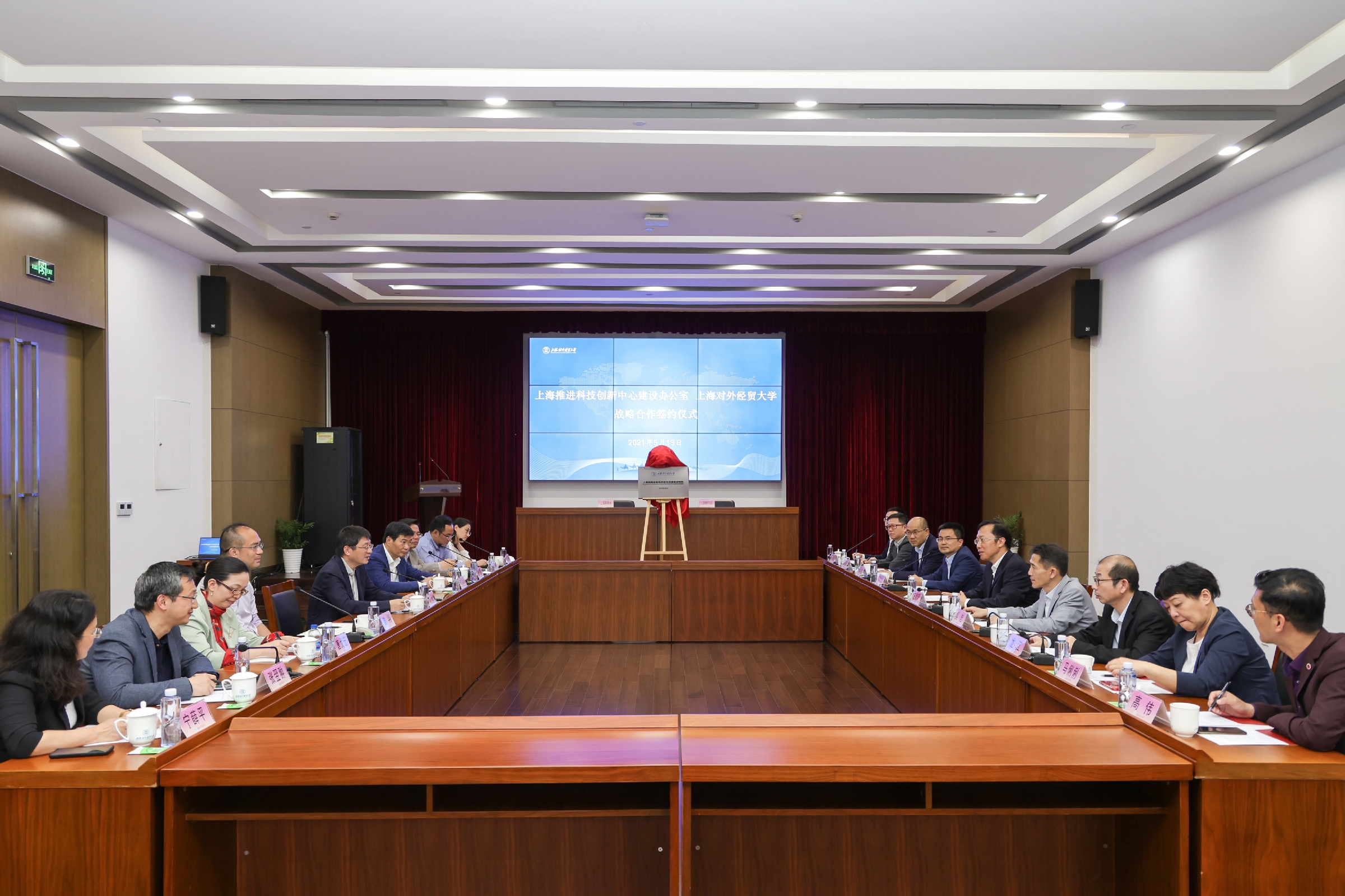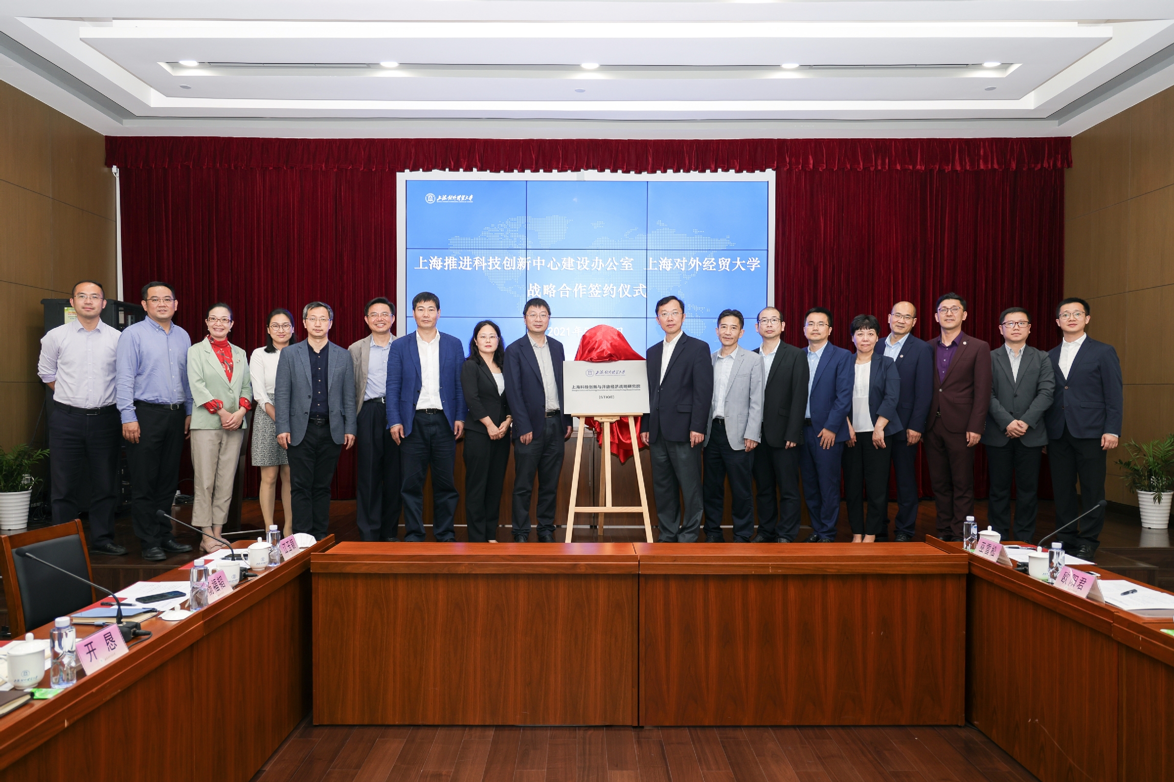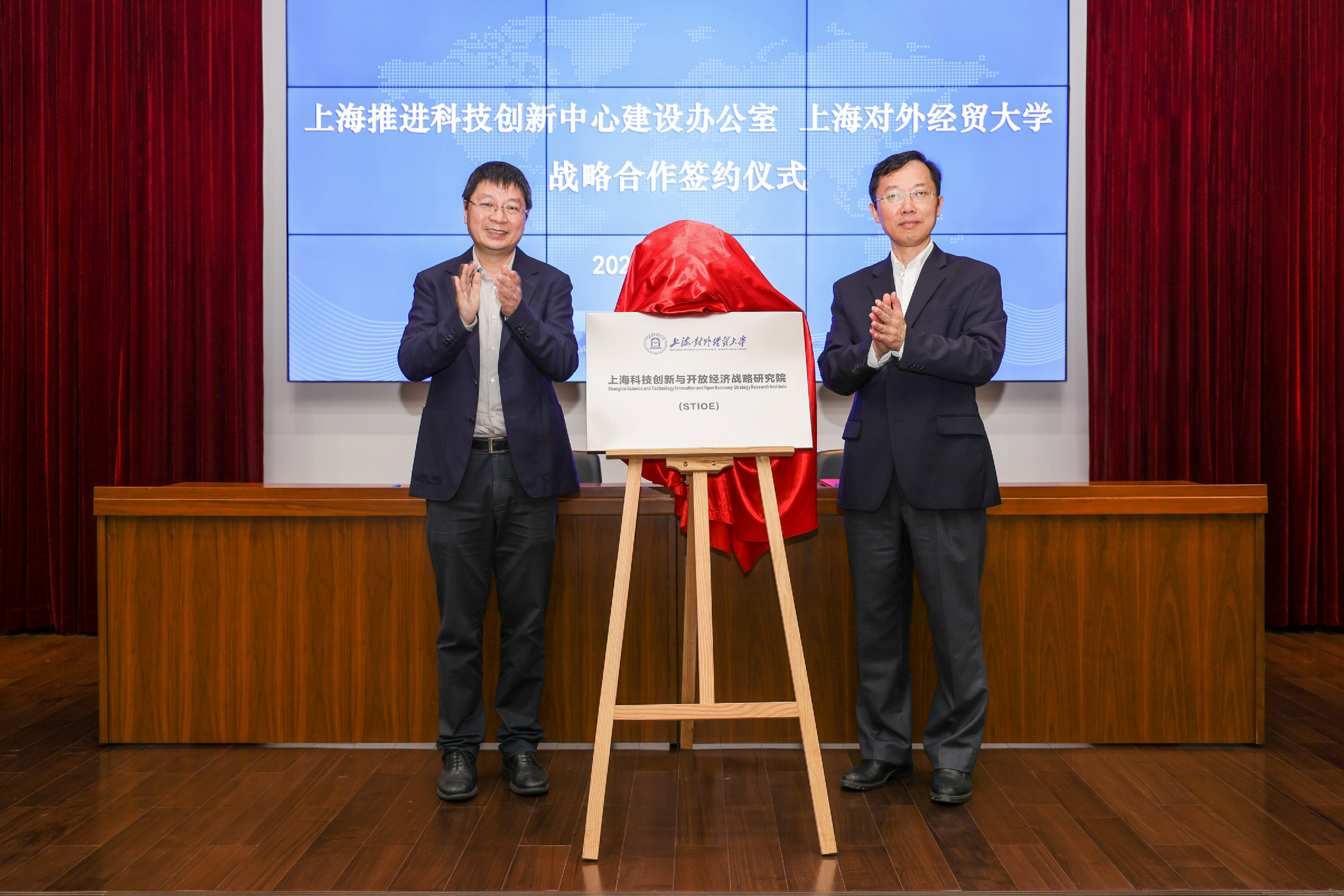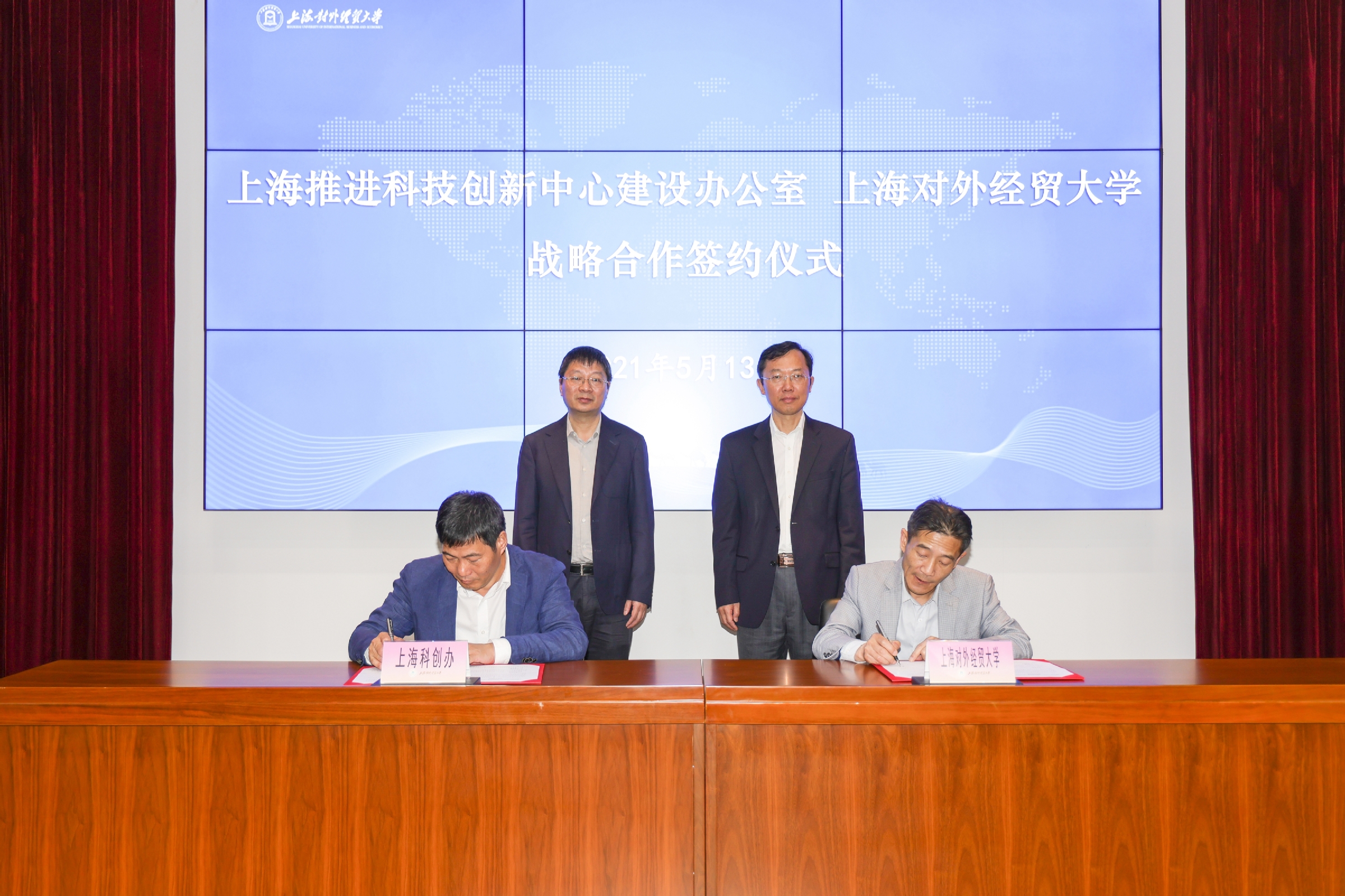 5月13日下午,上海推進科技創新中心建設辦公室(簡稱上海科創辦)與上海對外經貿大學戰略合作簽約儀式在學校古北校區綜合樓舉行。上海科創辦執行副主任彭崧、上海對外經貿大學校長汪榮明出席簽約儀式,并為“上海科技創新與開放經濟戰略研究院”(簡稱研究院)揭牌。上海科創辦專職副主任陳堯水、上海對外經貿大學副校長吳忠代表雙方簽署戰略合作協議。雙方有關部門負責人參加簽約儀式。儀式由吳忠主持。