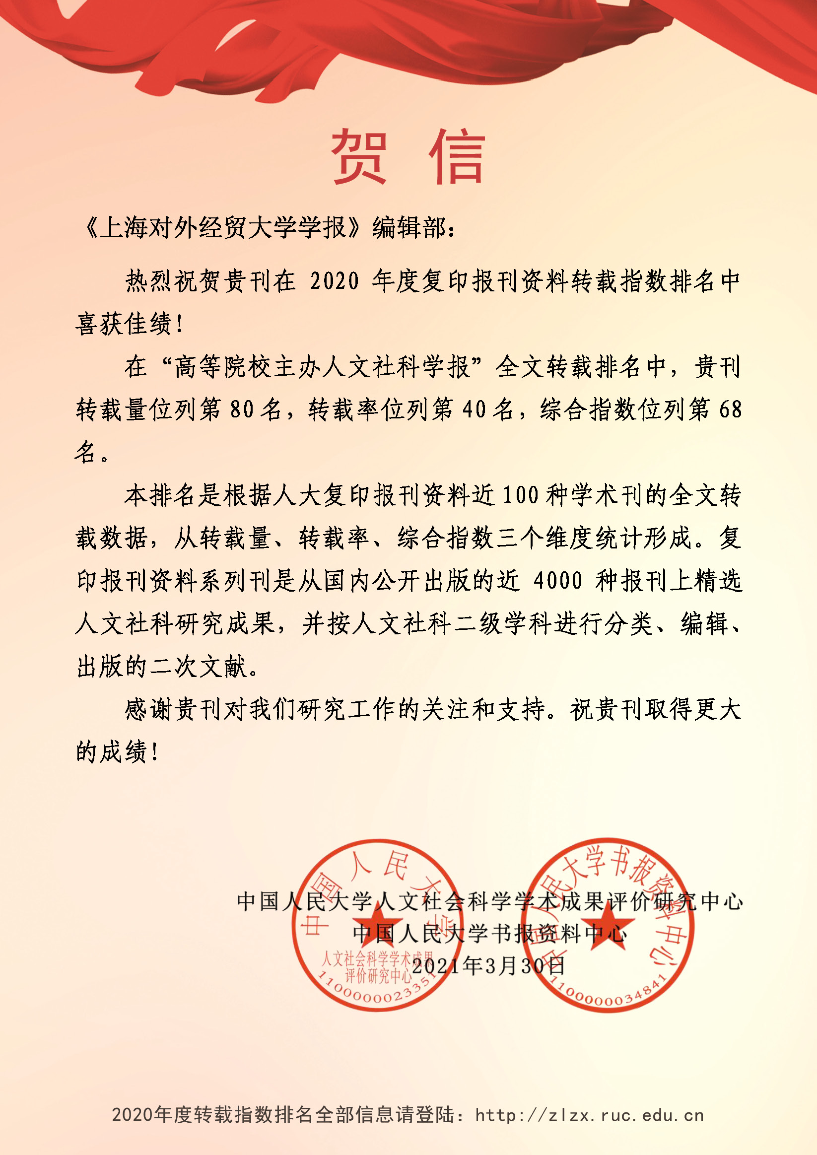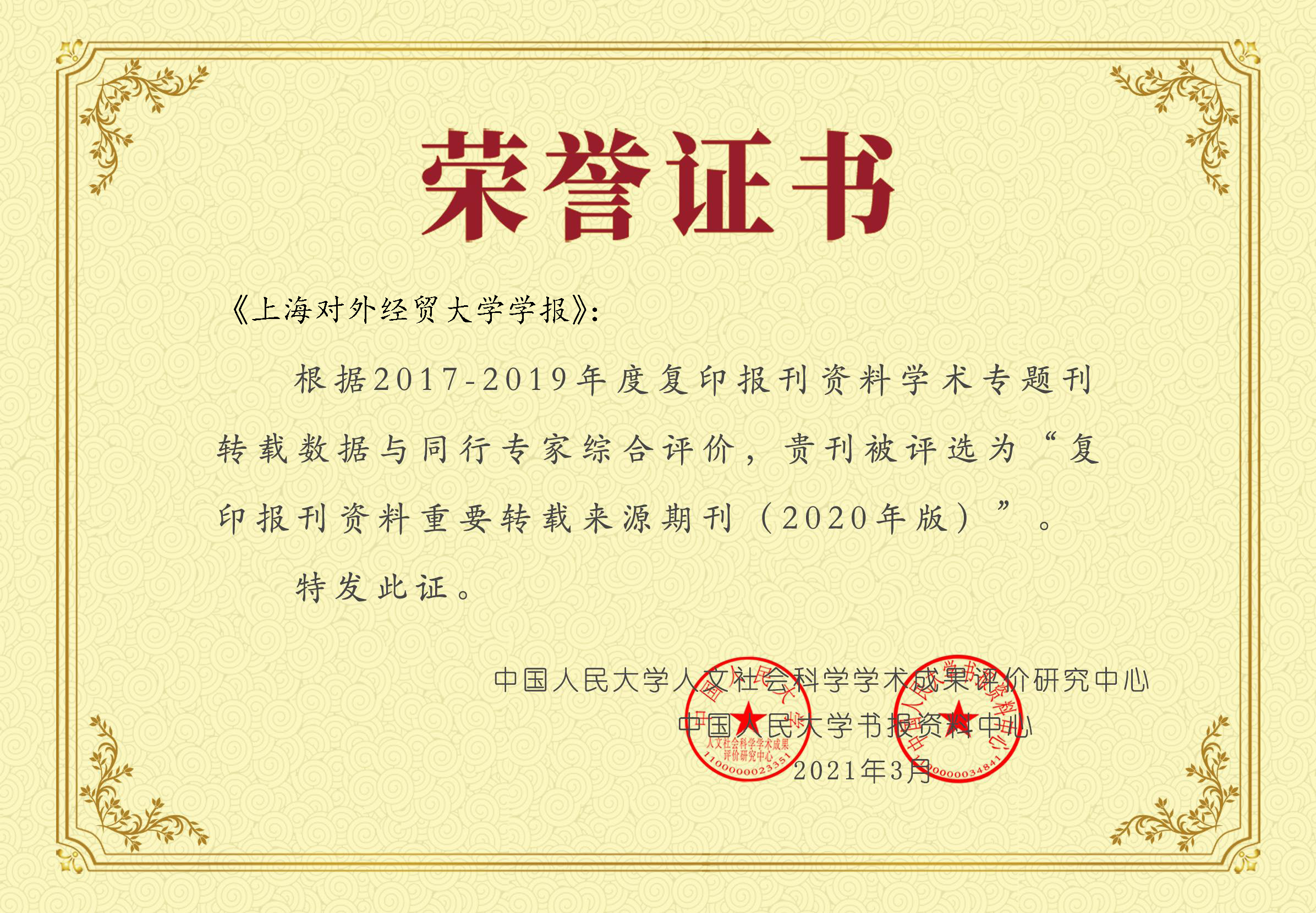 此外,根據中國人民大學人文社會科學學術成果評價研究中心和中國人民大學書報資料中心發布的“復印報刊資料重要轉載來源期刊(2020版)”,《上海對外經貿大學學報》和我社另一本期刊《國際商務研究》繼續入選“復印報刊資料重要來源期刊”。