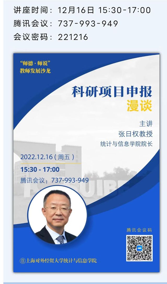 ,上經貿大統計與信息學院在線舉行第四期“師德·師說”教師發展沙龍。統計與信息學院院長張日權教授為大家帶來《科研項目申報漫談》專題分享,歡迎廣大師生積極參與。