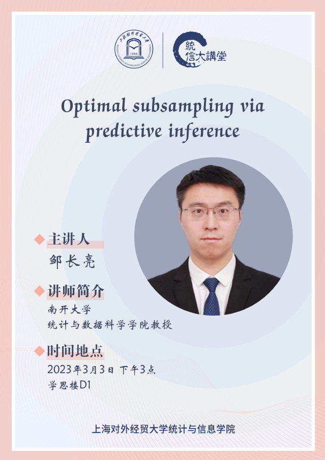 3月3日(周五)15:00,南開(kāi)大學(xué)鄒長(zhǎng)亮教授學(xué)術(shù)講座:Optimal subsampling via predictive inference,歡迎廣大教師積極參與。