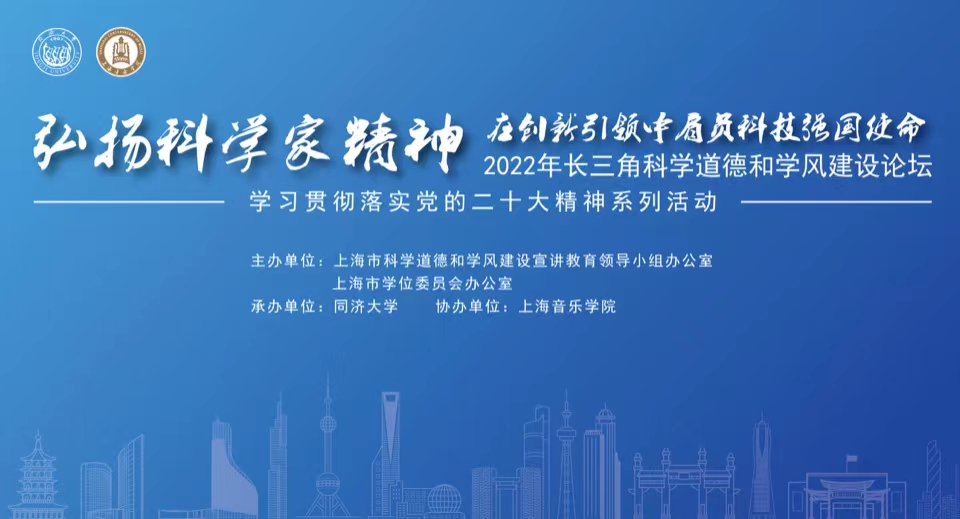 12月10日,2022年長三角科學道德和學風建設論壇在同濟大學舉行。本次論壇由上海市科學道德和學風建設宣講教育領導小組辦公室、上海市學位委員會辦公室主辦,同濟大學承辦,上海音樂學院協(xié)辦。論壇旨在深入學習宣傳貫徹黨的二十大精神和習近平總書記關于大力弘揚科學家精神和加強學風建設的重要指示精神,進一步落實全國研究生教育會議精神,大力弘揚科學家精神,在創(chuàng)新引領中肩負科技強國使命。上海市科學技術協(xié)會副主席陳馨、上海市教育委員會副主任毛麗娟出席會議,來自長三角地區(qū)高校的相關領導和師生代表在線上線下參加了會議,會議由上海市教委高教處處長、市學位辦主任束金龍主持。