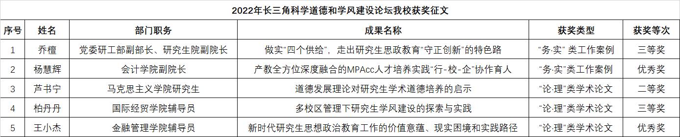 本次論壇面向長三角高校、科研院所研究生導師、研究生輔導員、研究生教育管理工作者、研究生征稿,共征集了來自54家單位投稿的主題征文731篇,其中獲獎工作案例58篇,獲獎論文88篇。我校2篇工作案例和3篇學術論文榮獲獎項,學校榮獲優(yōu)秀組織獎。