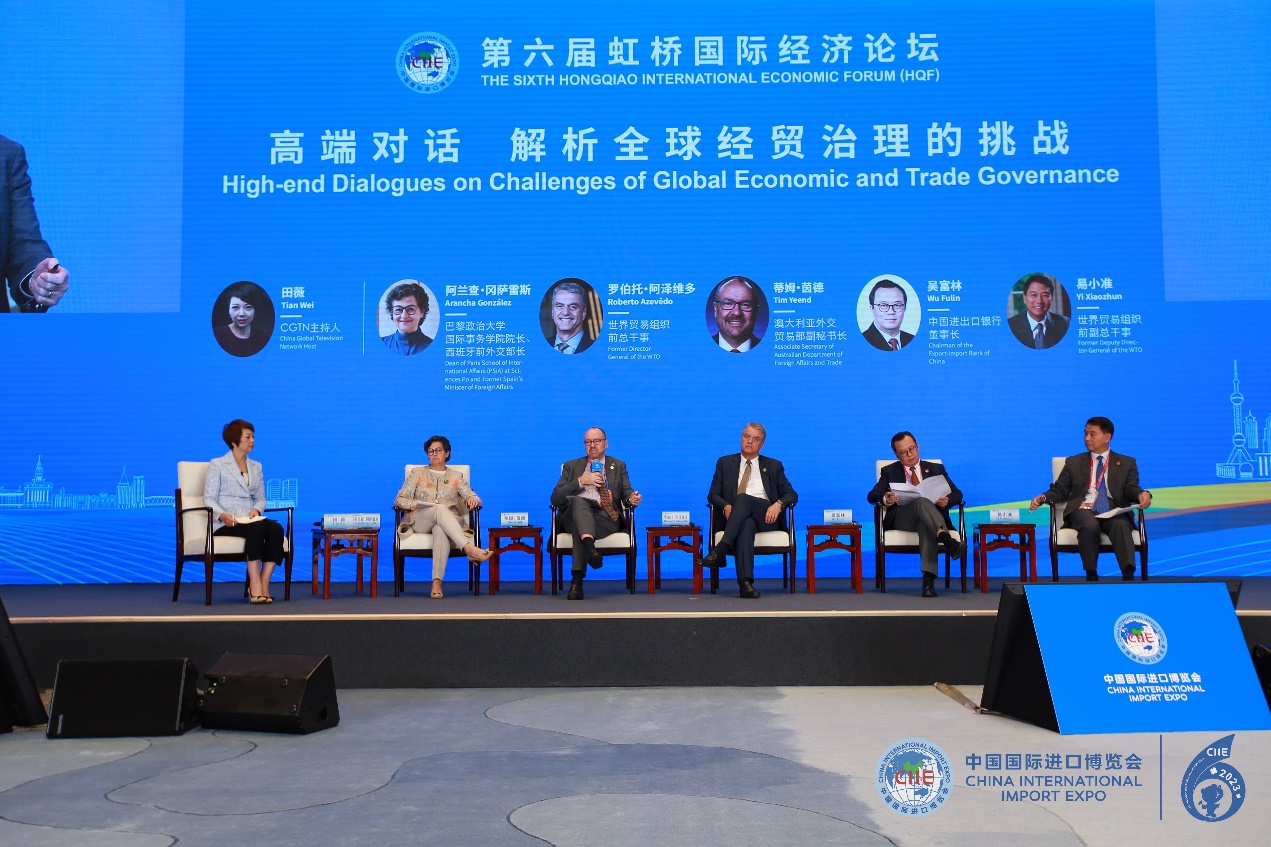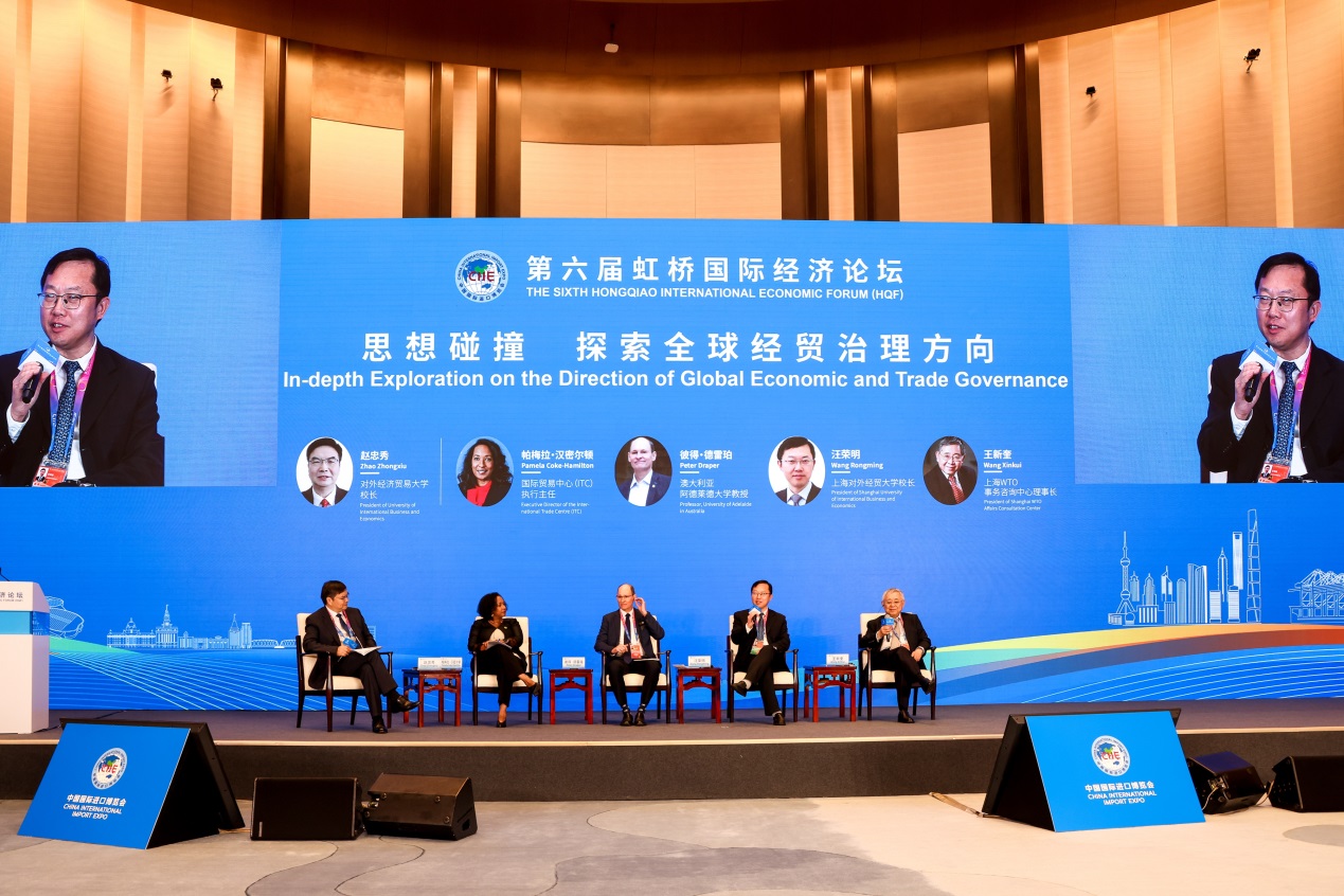 11月6日上午,由商務(wù)部主辦,對外經(jīng)濟貿(mào)易大學(xué)、上海對外經(jīng)貿(mào)大學(xué)和上海WTO事務(wù)咨詢中心承辦的第六屆虹橋國際經(jīng)濟論壇“堅守多邊貿(mào)易體制 完善全球經(jīng)貿(mào)治理”分論壇在國家會展中心(上海)成功舉行。商務(wù)部副部長凌激發(fā)表主旨演講,澳大利亞貿(mào)易和旅游部長兼特別國務(wù)部長Don Farrell發(fā)表視頻演講,巴黎政治大學(xué)國際事務(wù)學(xué)院院長,西班牙前外交部長AranchaGonzález、世界貿(mào)易組織前總干事Roberto Azevêdo、澳大利亞外交貿(mào)易部副秘書長Tim Yeend、國際貿(mào)易中心(ITC)執(zhí)行主任Pamela Coke-Hamilton、世界貿(mào)易組織前副總干事易小準、中國進出口銀行董事長吳富林、澳大利亞阿德萊德大學(xué)教授Peter Draper、上海WTO事務(wù)咨詢中心理事長王新奎、對外經(jīng)濟貿(mào)易大學(xué)校長趙忠秀、上海對外經(jīng)貿(mào)大學(xué)校長汪榮明、CGTN主持人田薇等嘉賓出席分論壇并發(fā)言討論。