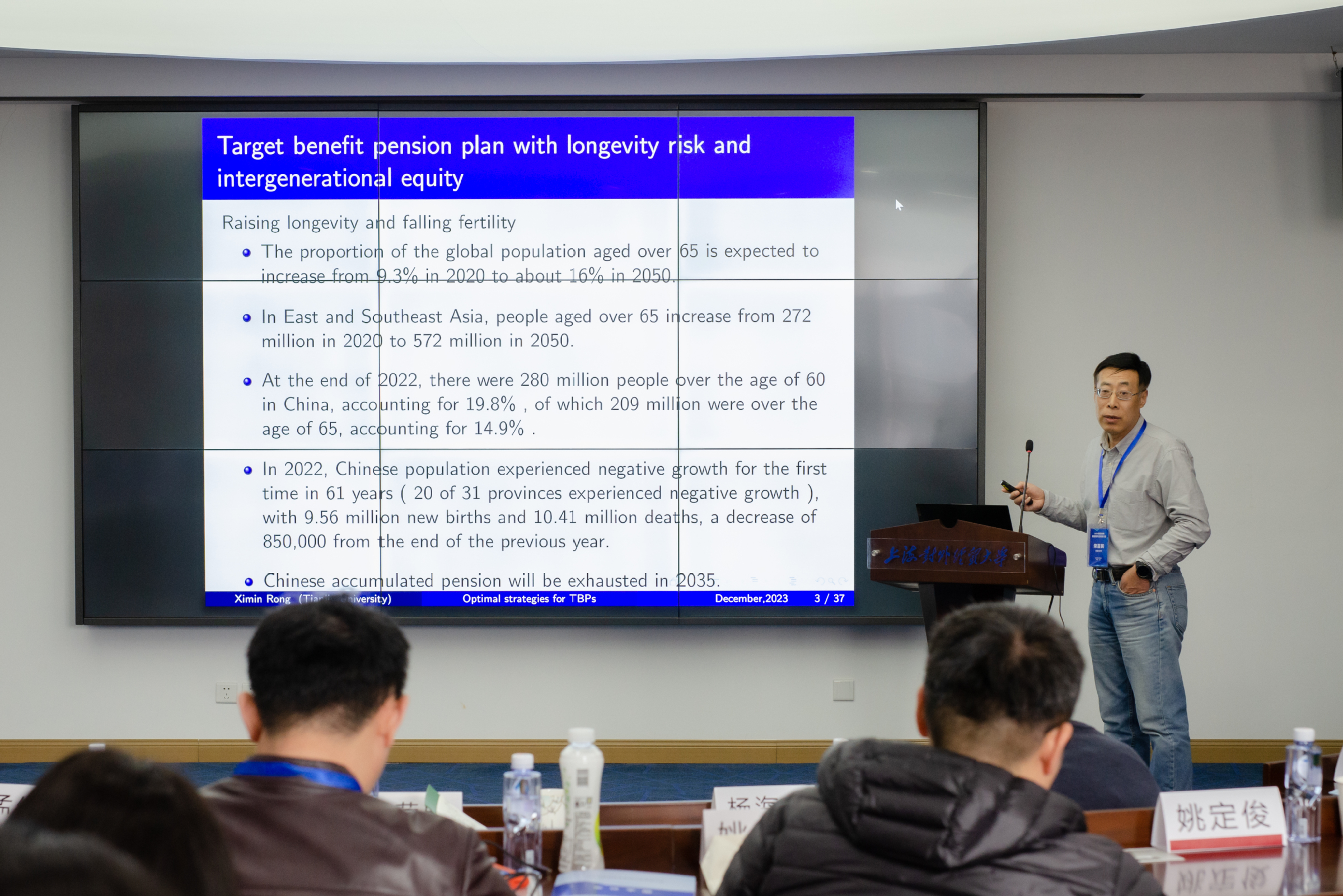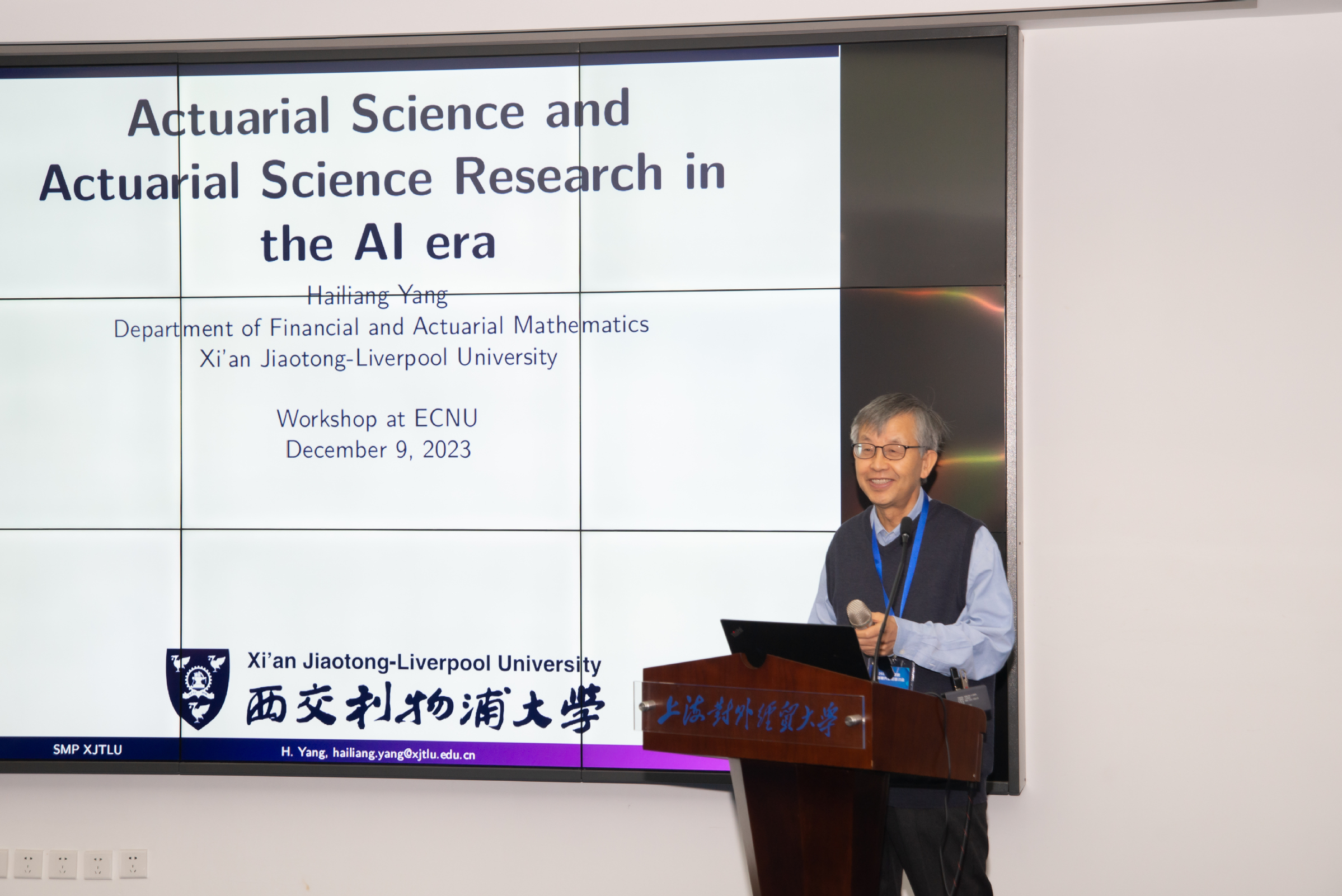 為促進和加強保險精算學(xué)領(lǐng)域科研人員之間的學(xué)術(shù)交流與合作,加快培養(yǎng)保險精算和交叉學(xué)科人才,2023年12月9日,由統(tǒng)計應(yīng)用與理論研究創(chuàng)新引智基地(以下簡稱“111引智基地”)主辦,上海對外經(jīng)貿(mào)大學(xué)統(tǒng)計與信息學(xué)院、華東師范大學(xué)統(tǒng)計學(xué)院和統(tǒng)計與數(shù)據(jù)科學(xué)前沿理論及應(yīng)用教育部重點實驗室聯(lián)合協(xié)辦的“2023保險精算最新研究進展研討會”在上海對外經(jīng)貿(mào)大學(xué)古北校區(qū)順利舉行。上海對外經(jīng)貿(mào)大學(xué)校長、111引智基地負責(zé)人汪榮明教授出席會議并致辭。來自西交利物浦大學(xué)、中國人民大學(xué)、中國科學(xué)技術(shù)大學(xué)、武漢大學(xué)、蘇州大學(xué)、天津大學(xué)、南京師范大學(xué)、香港理工大學(xué)、廣東外語外貿(mào)大學(xué)、南京財經(jīng)大學(xué)、福建師范大學(xué)、華東師范大學(xué)、上海對外經(jīng)貿(mào)大學(xué)等十余所高校的專家學(xué)者及師生圍繞保險精算學(xué)的研究進展進行了深入研討和交流。會議開幕式由上海對外經(jīng)貿(mào)大學(xué)統(tǒng)計與信息學(xué)院副院長趙倩主持。