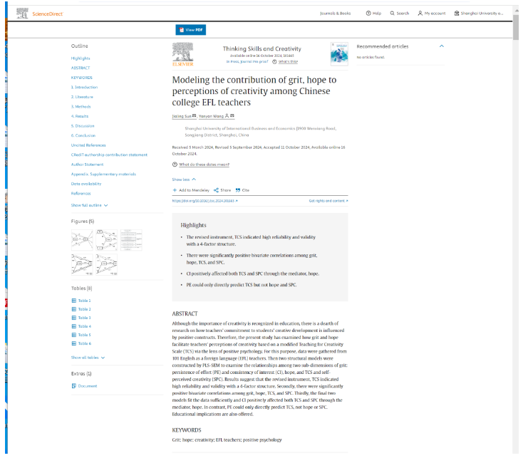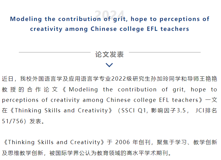 學術前沿|我校研究生孫加玲和導師王艷艷教授合作論文在Thinking Skills and Creativity發表