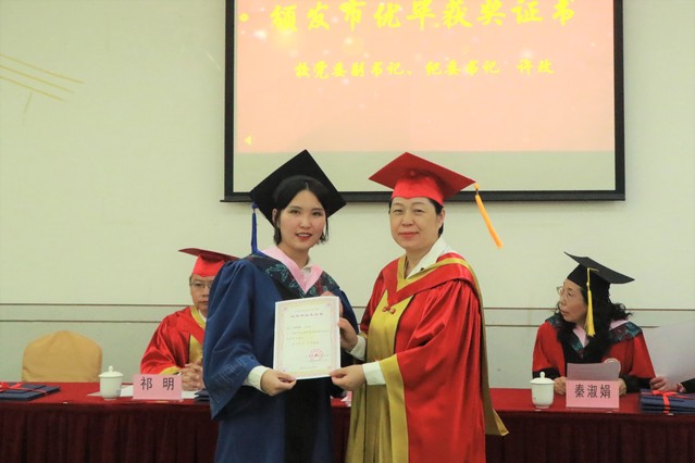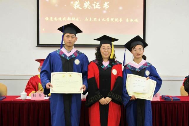 校黨委統戰部部長、馬克思主義學院院長秦淑娟為校優秀畢業生、校優秀碩士學位論文獲獎學生陳夢瑤、霍廷然頒發獲獎證書。