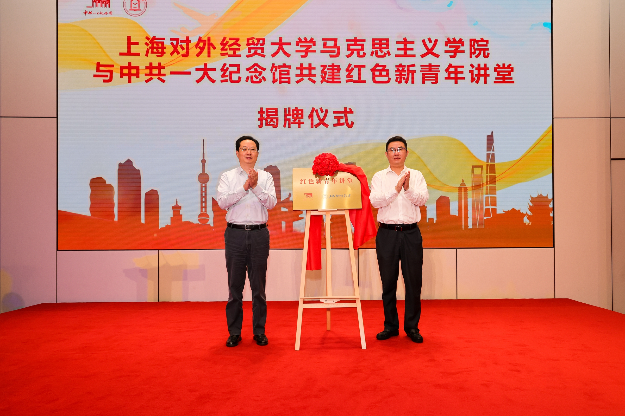 課程開始之前,上海對(duì)外經(jīng)貿(mào)大學(xué)馬克思主義學(xué)院與中共一大紀(jì)念館共建紅色新青年講堂揭牌儀式與紅色地圖點(diǎn)亮儀式隆重舉行。市委宣傳部副部長(zhǎng)、市文明辦主任潘敏,市教衛(wèi)工作黨委副書記、市教委副主任閔輝,上海對(duì)外經(jīng)貿(mào)大學(xué)黨委書記殷耀,中共一大紀(jì)念館黨委書記、館長(zhǎng)薛峰,市教委德育處處長(zhǎng)沙軍出席。