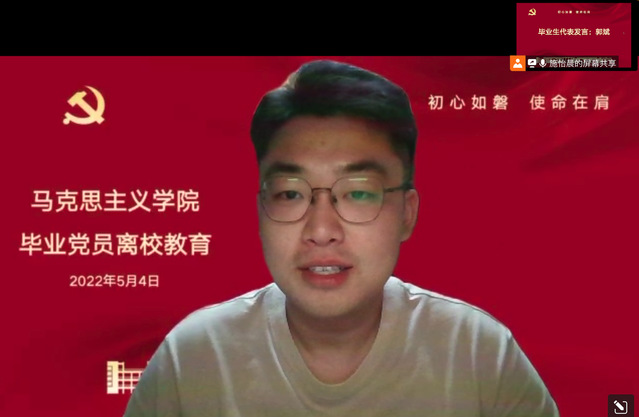 畢業生黨員代表郭斌進行發言,追憶與同學一起在上經貿大、在馬克思主義學院度過的研究生生涯,暢談兩年半來的收獲和改變,并立志未來將始終傳承奮斗擔當,勇做走在時代前列的奮進者、開拓者、奉獻者。
