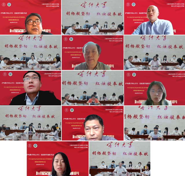 上海對外經貿大學馮國芳、劉海泉、張耿慶、羅國輝、李秀敏、翟海濤、劉誠潔和喀什大學韓文書、曹立中、姑扎麗努爾·托乎提、武威利、許科龍波、馬峰、方旭光等14位思政課教師代表分別作了精彩的主題發言,結合各自思想和工作實際分享了學習體會。