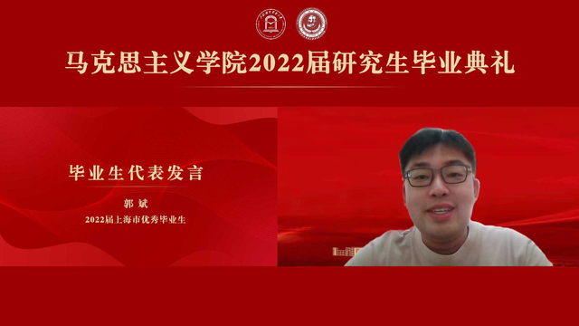 2022屆上海市優秀畢業生獲得者郭斌同學作為畢業生代表發言。他回顧了自己在學院修煉、沉淀和蛻變的成長經歷,感恩學校和學院的培養和關懷,與最好的導師和最親愛的同學告別,并表示在未來的人生征途上,將不忘初心,不負老師們的期望,永葆上經貿大馬院人的精神底色,帶著榮耀和夢想,堅定而自信地走向未來。