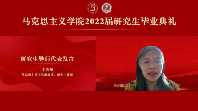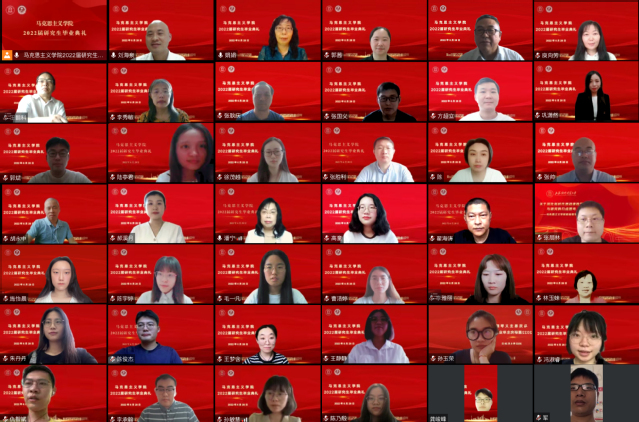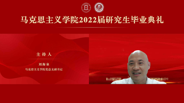 2022年6月28日上午,我院舉行2022屆碩士研究生線上畢業典禮。校黨委宣傳部部長、馬克思主義學院黨總支書記郭茜,馬克思主義學院院長秦淑娟,黨總支副書記劉海泉,副院長馮國芳、庾向芳出席畢業典禮。學院2022屆碩士畢業生、2022屆碩士生導師代表、研究生任課老師以及研一、研二學生代表參加典禮。典禮由學院黨總支副書記劉海泉主持。
