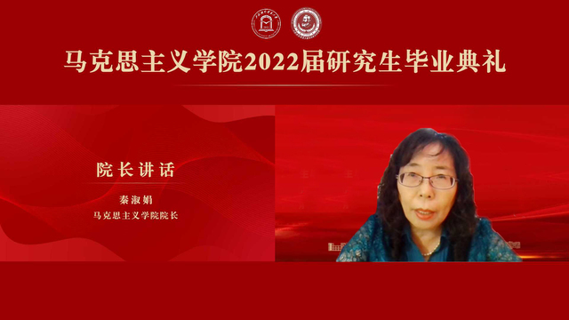 馬克思主義學院院長秦淑娟最后為全體畢業生送上畢業寄語。秦院長首先代表學院向圓滿完成學業的2022屆碩士畢業生表示熱烈的祝賀,向辛勤培育學生的各位老師表示衷心的感謝。她充分肯定了兩年半來2022屆畢業生的篤行好學、腳踏實地、綻放自我,肯定了同學們在學習中獲得的豐碩成果、在實踐中綻放的青春力量、在各項活動中展現的別樣風采。最后她寄語全體畢業生:一是要有做大事的志氣。思想境界要高,要胸懷天下,要將小我融入大我之中,為國家、為社會貢獻自己的力量;二是要有做成事的骨氣。面對世界百年未有之大變局和中華民族偉大復興的戰略全局,面對人生未來的各種選擇,要有積極的人生態度,更要有敢為人先、勇于創新的精神,讓青春在磨礪奮斗中綻放光彩;三是要有做好事的底氣。讀經典,悟精神,把讀書學習作為自己的必修課,讓勤奮學習成為青春遠航的動力,讓增長本領成為青春搏擊的能量。