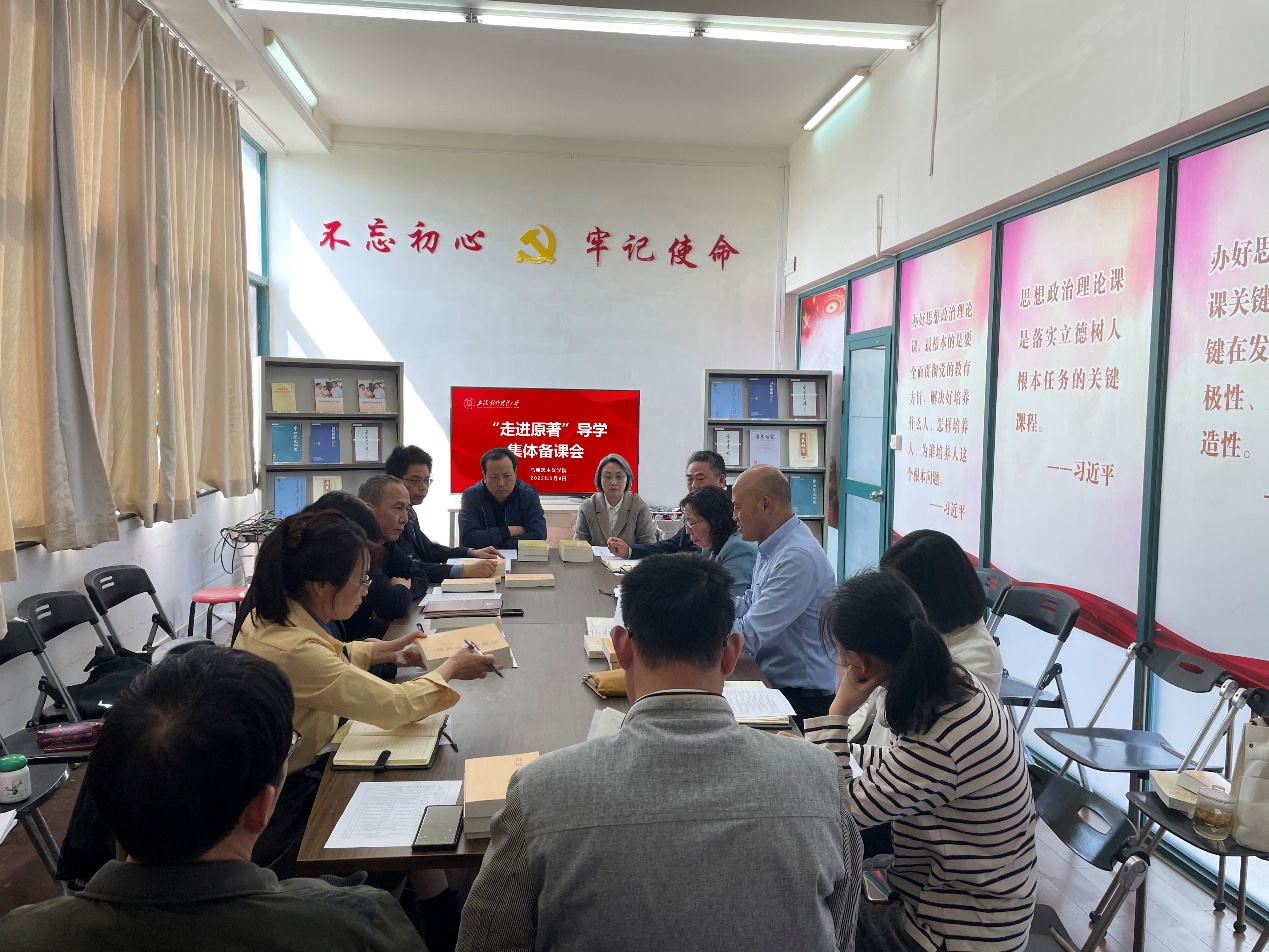 為深入開展學(xué)習(xí)貫徹習(xí)近平新時代中國特色社會主義思想主題教育,切實在“學(xué)”上下功夫,發(fā)揮學(xué)院學(xué)習(xí)研究宣傳馬克思主義的主陣地作用,切實推進(jìn)主題教育學(xué)習(xí)入耳入腦入心、走深走實、見行見效。5月9日下午,馬克思主義學(xué)院主題教育宣講團開展了“走進(jìn)原著”導(dǎo)學(xué)首場集體備課會,學(xué)院黨總支副書記(主持工作)劉海泉首先介紹了導(dǎo)學(xué)的最新要求。隨后全體宣講團教師共同展開研討,就教學(xué)資源、授課形式等問題進(jìn)行了深入討論,并進(jìn)一步優(yōu)化了導(dǎo)學(xué)菜單。集體備課會為“走進(jìn)原著”課程的開展做了充分的準(zhǔn)備。