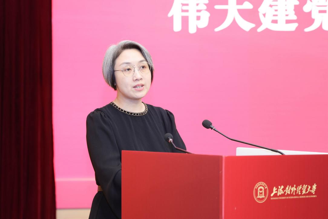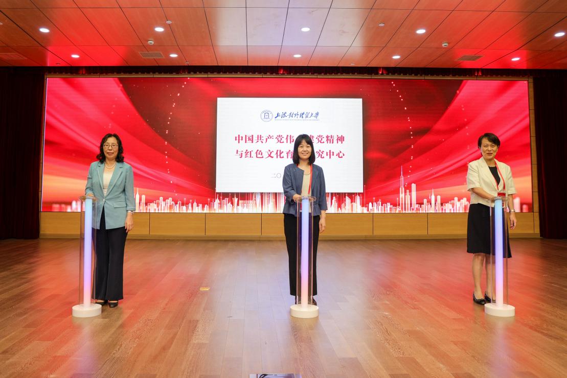 上海市教衛工作黨委宣傳處處長耿紹寧,上海市教育科學研究院副院長、德育發展研究院院長王戎,上海對外經貿大學馬克思主義學院院長秦淑娟為上海對外經貿大學中國共產黨偉大建黨精神研究與紅色育人研究中心共同揭牌。