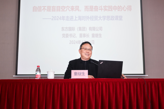 4月11日,上海對外經貿大學馬克思主義學院邀請東方國際集團黨委書記、董事長童繼生走進思政課課堂,圍繞“堅定不移擴大對外開放,助力經濟高質量發展”主題,以“自信不是盲目空穴來風,而是奮斗實踐中的心得”為題目,結合自身經歷與日常工作實踐,為大學生生動講述了在習近平總書記關于對外開放的重要論述指引下,中國高水平對外開放事業所取得的成就。《習近平新時代中國特色社會主義思想概論》《毛澤東思想和中國特色社會主義理論體系概論》《改革開放史》《“一帶一路”與經濟全球化專題》等課程的師生共同聆聽本次“大思政課”。活動由馬克思主義學院黨總支副書記(主持工作)劉海泉主持。