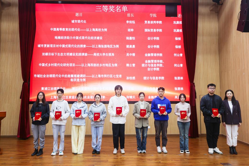 校黨委副書(shū)記、紀(jì)委書(shū)記章益國(guó)為特等獎(jiǎng)團(tuán)隊(duì)頒發(fā)榮譽(yù)證書(shū)。