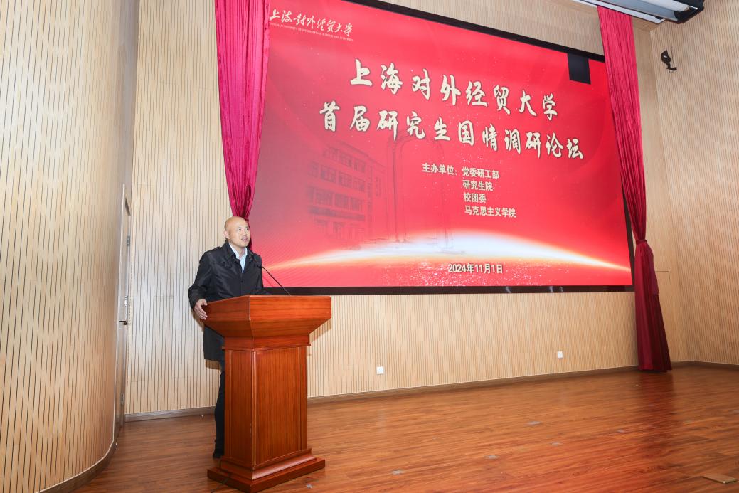 為充分發(fā)揮思政課在研究生教學(xué)中的引領(lǐng)作用,推動(dòng)研究生思政課教育教學(xué)改革創(chuàng)新,提高研究生理論與實(shí)踐相結(jié)合的能力,11月1日,上海對(duì)外經(jīng)貿(mào)大學(xué)首屆研究生國(guó)情調(diào)研論壇“中國(guó)式現(xiàn)代化的實(shí)踐探索”舉行。本次論壇由黨委研究生工作部、研究生院、校團(tuán)委及馬克思主義學(xué)院共同主辦。校黨委副書(shū)記、紀(jì)委書(shū)記章益國(guó)致辭,黨委研究生工作部部長(zhǎng)繆韻笛、研究生院常務(wù)副院長(zhǎng)郝程程、校團(tuán)委書(shū)記司徒力云出席論壇,馬克思主義學(xué)院領(lǐng)導(dǎo)班子全體成員及學(xué)院教師與同學(xué)參加了論壇。開(kāi)幕式由馬克思主義學(xué)院黨委書(shū)記劉海泉主持。