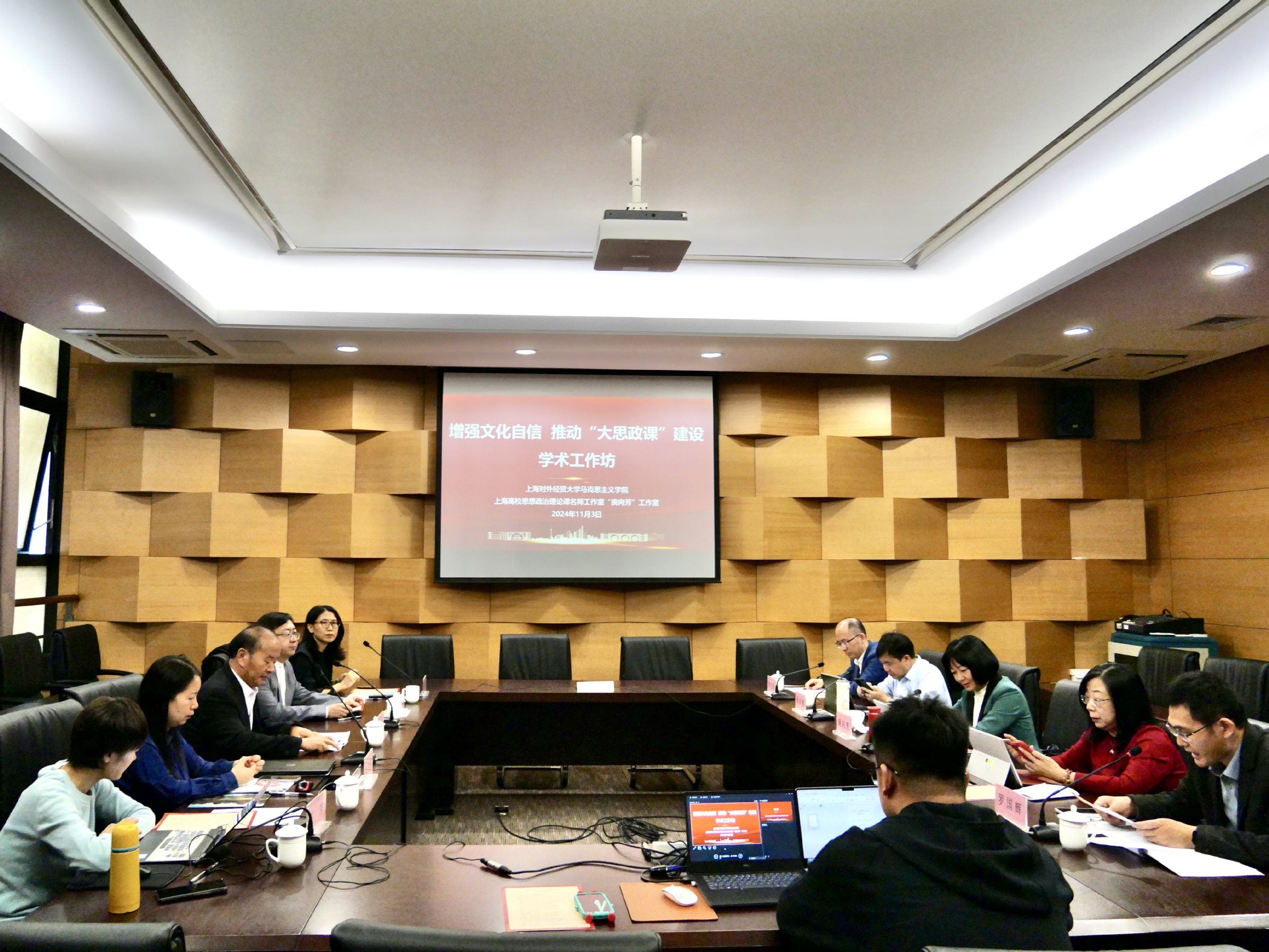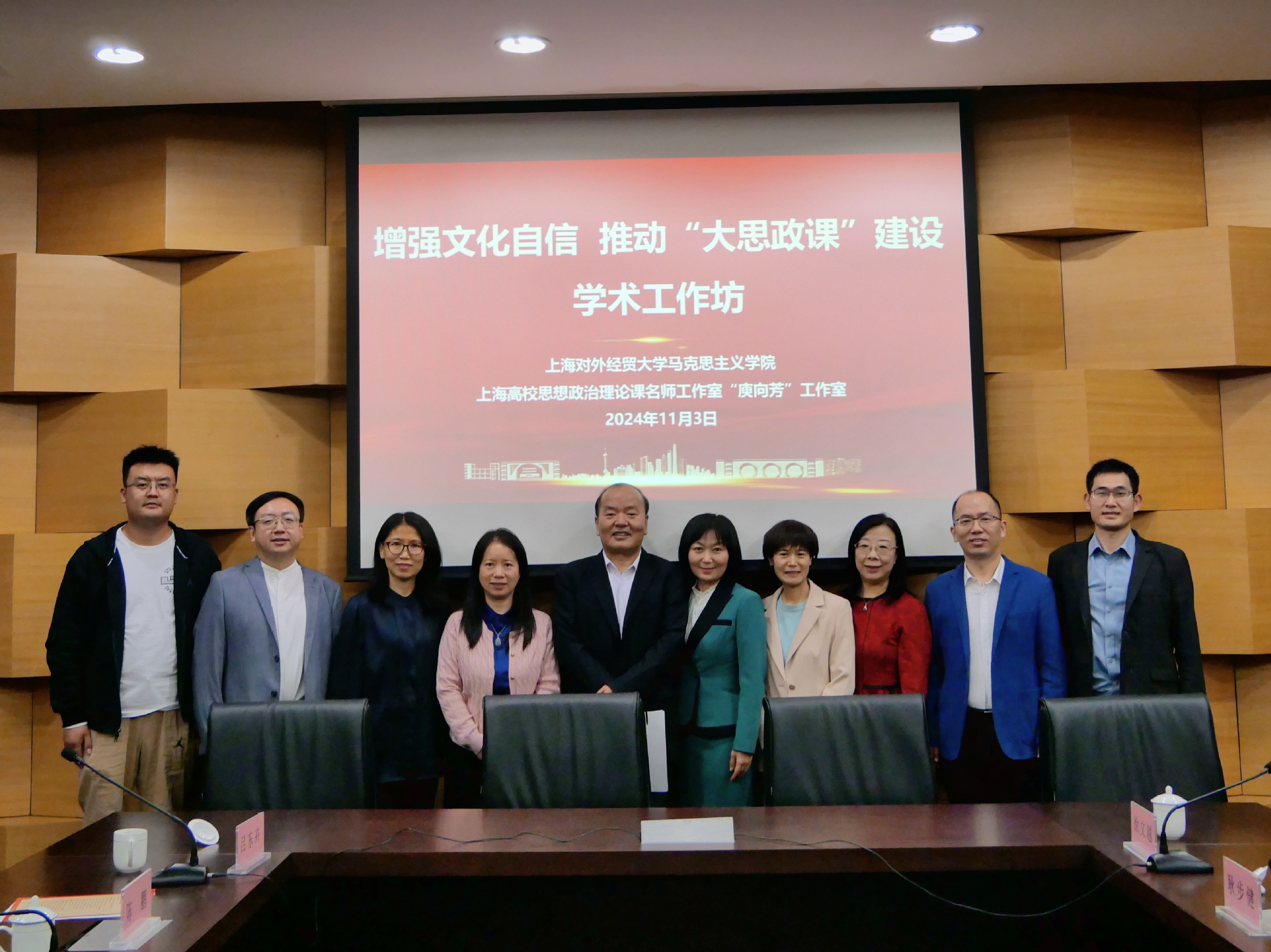 11月3日,上海對外經貿大學馬克思主義學院、上海高校思想政治理論課名師工作室“庾向芳”工作室舉辦了主題為“增強文化自信,推動‘大思政課’建設”學術工作坊,來自上海外國語大學、上海理工大學、上海中醫藥大學、上海師范大學、上海立信金融會計學院以及杉達學院、上海城建職業學院等學校的馬院院長與多位上海高校思想政治理論課名師工作室主持人,圍繞文化自信在“大思政課”中的關鍵作用展開深入討論,為新時代“大思政課”提供創新思維和實踐路徑。我校馬克思主義學院思政課教師與研究生參加了會議。