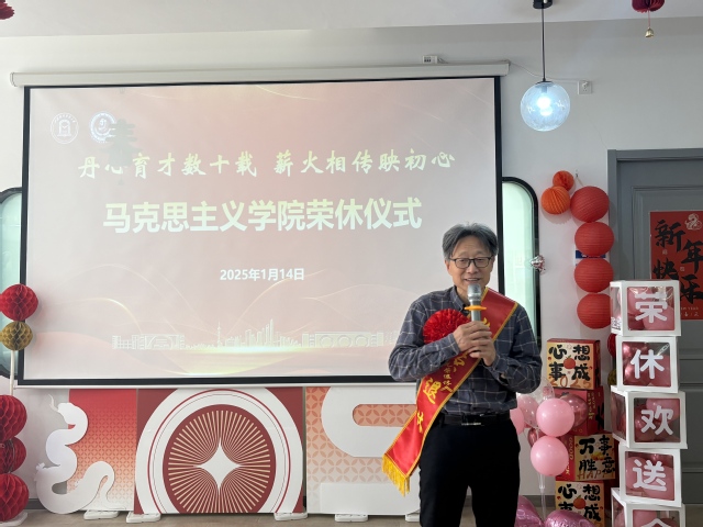 劉海泉代表學院全體師生向于治國及秦淑娟致以崇高敬意和誠摯祝福。兩位老師幾十年如一日愛崗敬業(yè)、勇挑重擔,無私奉獻,為學校及學院的發(fā)展貢獻力量,是青年老師們的優(yōu)秀榜樣。希望兩位老師今后繼續(xù)關心與支持學院事業(yè)發(fā)展,與學院保持密切聯(lián)系,常回來看看。也希望學院教師們能以兩位教授為榜樣,傳承馬院精神,砥礪奮進,更好地躬耕教壇,弘揚教育家精神,傳承高尚師德,落實立德樹人使命。
