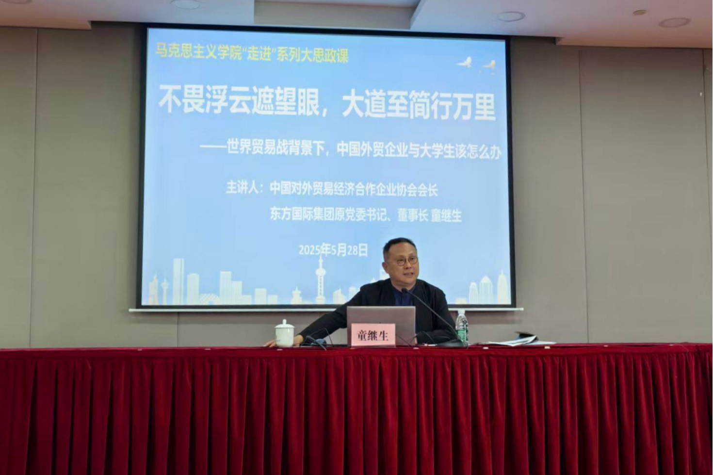 5月28日上午,上海對外經貿大學馬克思主義學院“走進”系列大思政課開講,邀請中國對外貿易經濟合作企業協會會長、東方國際集團原黨委書記、董事長童繼生再次走進思政課課堂,以“不畏浮云遮望眼,大道至簡行萬里”為題,結合國有企業管理經歷和人生閱歷,為大學生生動講述了在當前國際形勢下,中國外貿企業與當代大學生的應對之策。《習近平新時代中國特色社會主義思想概論》課程的師生共同聆聽本次“大思政課”。本次課程由上海對外經貿大學馬克思主義學院黨委書記劉海泉主持。