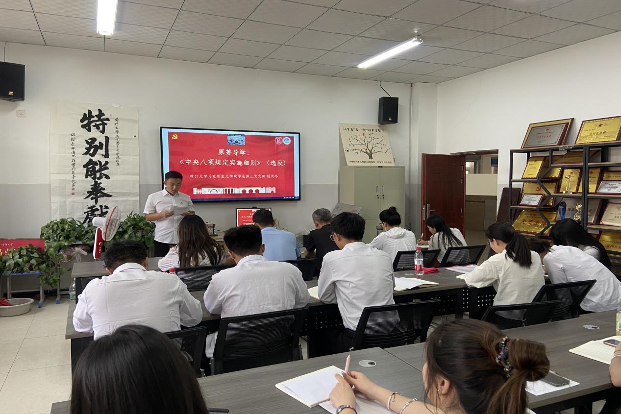 在理論深學環節,上海對外經貿大學馬克思主義學院學生第一黨支部王馨瑋、喀什大學馬克思主義學院學生第三黨支部楊肖冬分別領學《反對本本主義》及《中央八項規定實施細則》選段,帶領廣大黨員同志讀原著,感悟經典著作的深刻內涵。