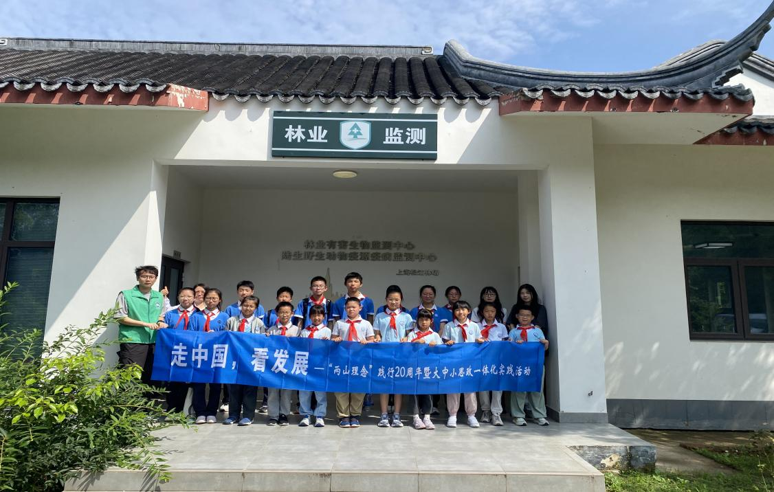 在松江佘山,實(shí)踐活動(dòng)創(chuàng)新采用“大學(xué)—附校”跨學(xué)段聯(lián)動(dòng)模式,一支由上海對(duì)外經(jīng)貿(mào)大學(xué)及其附屬松江實(shí)驗(yàn)學(xué)校的小學(xué)生、中學(xué)生和大學(xué)生共同參與的20余人青少年隊(duì)伍共同開(kāi)展大中小思政一體化實(shí)踐活動(dòng)。隊(duì)員們走進(jìn)松江林場(chǎng),參觀林業(yè)有害生物監(jiān)測(cè)中心、聆聽(tīng)林長(zhǎng)制科普講解、參與昆蟲(chóng)館研學(xué)活動(dòng),直觀感受生態(tài)治理成效。活動(dòng)創(chuàng)新采用“小學(xué)生記錄生態(tài)現(xiàn)象、初中生提問(wèn)探究、大學(xué)生分析總結(jié)”的梯度學(xué)習(xí)模式,讓不同學(xué)段青少年在互動(dòng)中深化對(duì)“兩山”理念的理解,切實(shí)體會(huì)生態(tài)保護(hù)與發(fā)展的緊密關(guān)聯(lián),為生態(tài)文明建設(shè)培育“接力者”。