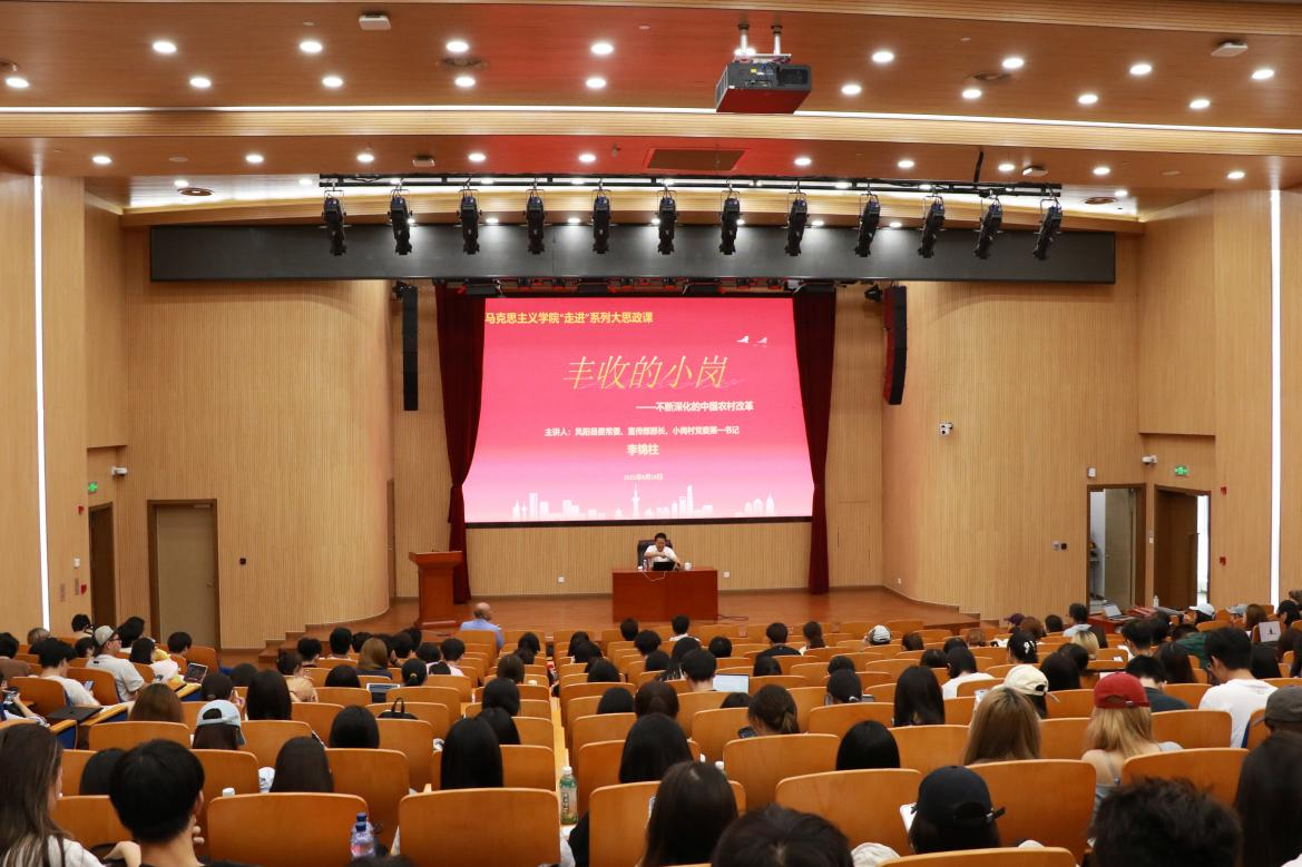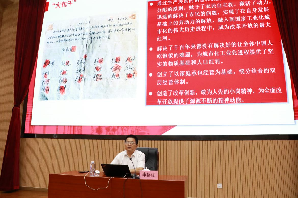 在第八個“中國農民豐收節”來臨之際,9月18日上午,馬克思主義學院邀請安徽省鳳陽縣縣委常委、宣傳部部長、小崗村黨委第一書記李錦柱再次走進學校的思政課課堂,以“豐收的小崗——不斷深化的中國農村改革”為主題,從一名基層書記的視角,為學生生動講述小崗村如何賡續改革基因,打造鄉村振興新樣板的故事。《習近平新時代中國特色社會主義思想概論》和《馬克思主義基本原理》課程的師生共同聆聽本次“大思政課”。課程由馬克思主義學院黨委書記劉海泉主持。