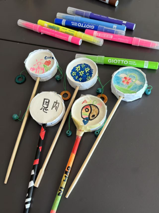 文化工作坊高潮迭起——學(xué)生們親手扎制毽子,課后庭院自發(fā)練習(xí)的身影,是文化生根的生動(dòng)注腳;團(tuán)扇制作從千年歷史講起,孩子們執(zhí)筆繪就熊貓、茉莉花,素白扇面綻放天馬行空的東方美學(xué);撥浪鼓DIY中,中國名字、太極八卦躍然鼓面,傳統(tǒng)樂器煥發(fā)新生。