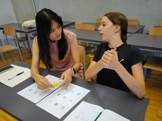在當(dāng)?shù)貎擅就翝h語教師卡迪婭(Katja)和安妮雅(Anja)的帶領(lǐng)下,海外實(shí)習(xí)團(tuán)隊(duì)的小老師們,以“一對二”或“一對三”的分組形式,幫助不同水平的學(xué)員實(shí)現(xiàn)了中文語言能力的階梯式提升。