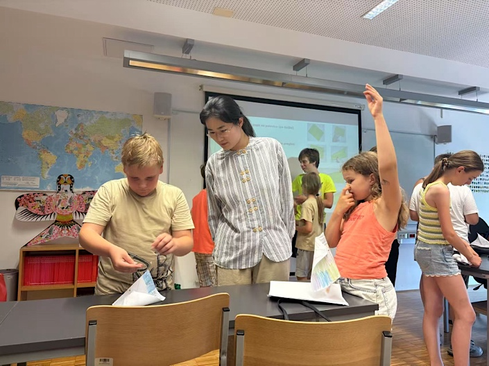 6月30日,在首次初級(jí)漢語(yǔ)班的課堂上,斯洛文尼亞當(dāng)?shù)貪h語(yǔ)教師Katja(卡迪婭)負(fù)責(zé)課堂組織設(shè)計(jì)和知識(shí)串講,海外實(shí)習(xí)團(tuán)隊(duì)的漢語(yǔ)小老師們則負(fù)責(zé)進(jìn)行分組練習(xí)和知識(shí)鞏固。Katja以漢字演變視頻作為引入,通過(guò)“日、月、山”等象形字的動(dòng)態(tài)展示,讓孩子們充分感受到漢字的魅力。實(shí)習(xí)團(tuán)隊(duì)的漢語(yǔ)小老師們以漢字卡片、角色扮演等練習(xí)形式,讓孩子們將知識(shí)現(xiàn)學(xué)現(xiàn)用。此次科佩爾孔子課堂海外實(shí)習(xí),SUIBErs探索出了“一師串講+多師陪練”的教學(xué)新模式,極大提高了海外兒童漢語(yǔ)課堂的學(xué)習(xí)效率。