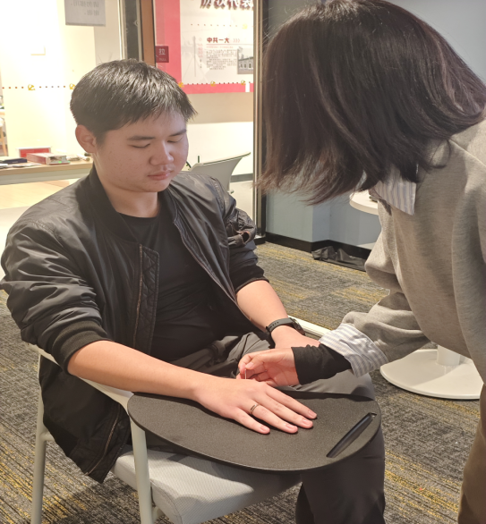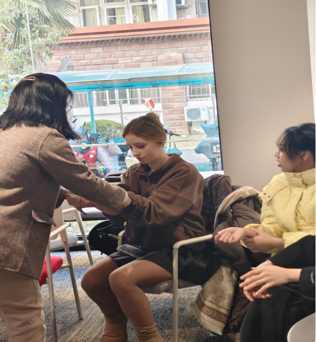 接下來老師帶領(lǐng)留學(xué)生開展了充滿傳統(tǒng)氣息的中醫(yī)體驗(yàn)。體檢區(qū)擺滿了中醫(yī)草藥和輔助工具。在老師的引導(dǎo)下,留學(xué)生先是聞中草藥的獨(dú)特香氣,接著品嘗了中藥保健食品。隨后,老師示范了推拿手法,同學(xué)們結(jié)對互相實(shí)踐,通過推拿放松肌肉。最后,大家親身體驗(yàn)了中醫(yī)傳統(tǒng)療法——針灸的魅力,學(xué)習(xí)了如何通過正確刺激穴位讓自己放松和舒緩。