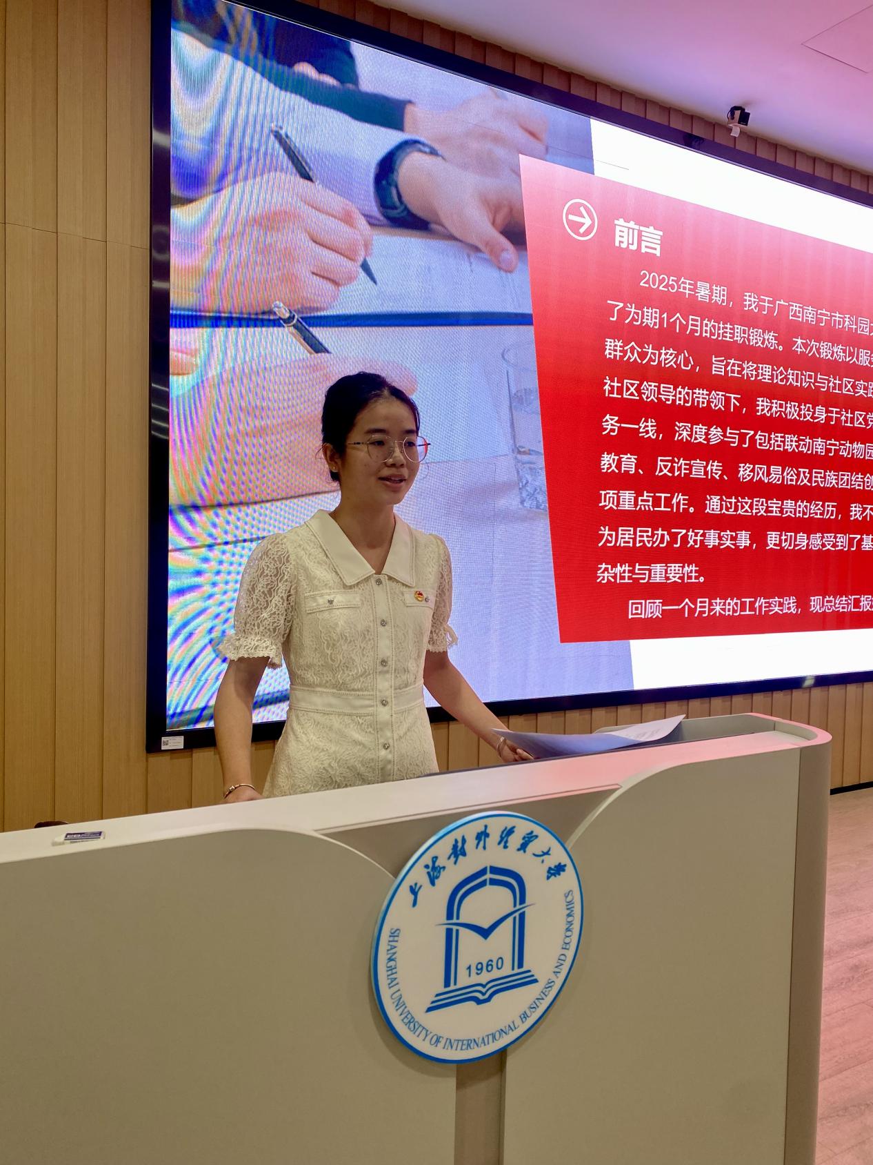9月21日下午,國際中文教育學院、會展與傳播學院2025年暑期社會實踐(掛職鍛煉)匯報展示會暨2025級新生入學“實踐第一課”在學思樓D1會議室順利舉辦。閔行區團委學工部負責人吳一烜、嘉定區真新街道團工委書記張藝、嘉定區江橋鎮團委副書記須雨虹、校團委副書記盧毅聰、國際中文教育學院黨總支副書記虞婭娜、會展與傳播學院團委書記張藝偉、國際中文教育學院團總支書記嚴潤杰、暑期社會實踐(掛職鍛煉)代表、新生代表參加會議。會議由嚴潤杰主持。