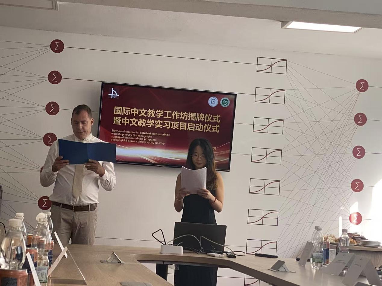 捷克時間9月29日上午,國際中文教育工作坊揭牌儀式暨中文教學實習項目啟動儀式在捷克布杰約維采商業技術學院隆重舉行。校黨委副書記、紀委書記章益國一行,捷克布杰約維采商業技術學院校領導團隊,孔子課堂中方負責人郝文鈞,國際中文教育學院2025年捷克海外實習團隊全體師生共同出席儀式。儀式由國際中文教育學院2025屆畢業生、孔子課堂志愿者周梓騰,當地大提琴家瓦茲拉夫共同主持。