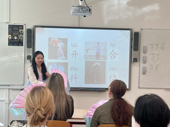 周瑞媛身著漢服,以中國舞為主題,向學生們介紹了中國舞基本動作的相關詞匯。著漢家衣裳,興禮儀之邦。她系統而生動地講解了中國舞的四大基礎動作——“”“”“”“,不僅介紹了每個動詞的中文字意,還逐一闡釋了每個動作的美學特征身體要領。