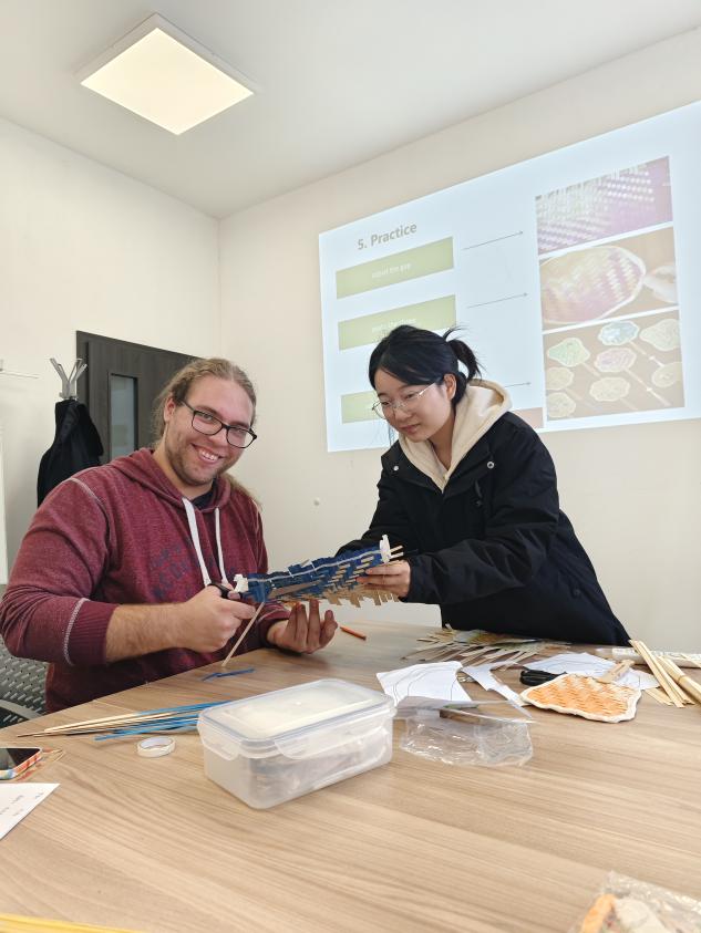 羅飄首先圍繞展開教學,先帶領學生掌握竹子”“竹扇”“竹條等基礎詞匯。課堂上,她結合手中的竹條、竹扇實物,用簡潔通俗的漢語搭配形象的肢體動作,向學生科普竹編相關知識,著重強調竹編是珍貴的中國傳統手藝。在后續的實踐操作環節中,她為學生分發竹條,手把手指導竹扇編制,成功實現語言學習與手工體驗的深度融合。