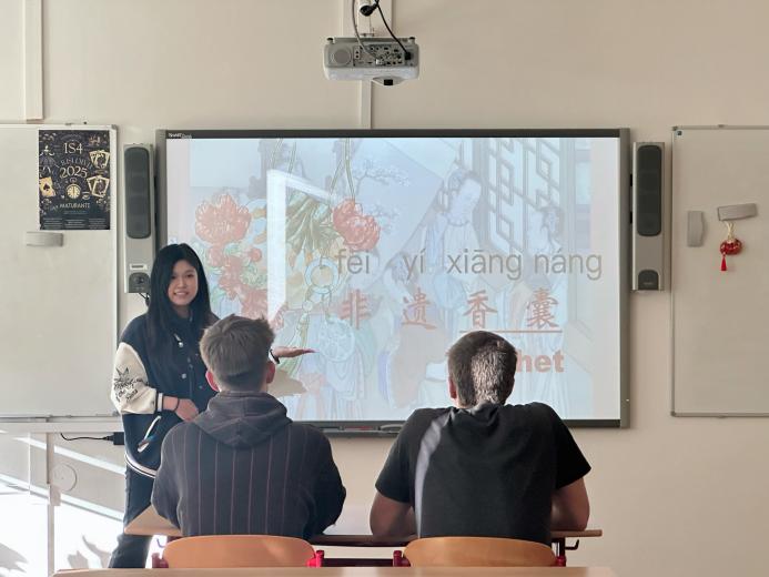 林星雨為學生帶來了一堂中國香囊制作文化課。她首先展示了茉莉、薰衣草、艾草等香材,引導學生學習相關中文詞匯。