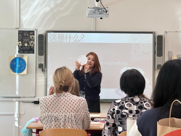 林星雨為學生帶來了一堂中國香囊制作文化課。她首先展示了茉莉、薰衣草、艾草等香材,引導學生學習相關中文詞匯。