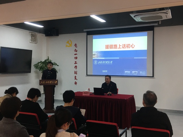馮國芳教授以《援疆路上話初心》為題,通過大量的圖片、文字、視頻等材料生動的講述了他在喀什大學援疆工作的經歷和收獲,黨課內容分為“最是讓人期待時”“發揮光熱為初心”“克服困難援疆情”“英雄贊歌鼓舞人”四個部分,從援疆的背景、各級領導的關懷、課程和專業的引入與建設、英雄事跡的鼓舞等多方面分享自己援疆經歷和體會,深入淺出的將一幅幅感人的畫面呈現在黨員眼前,讓現場聽眾深受感染和教育。此次講座給黨員同志們帶來的不僅是感動,更多的是鞭策,是對未來工作和生活的一種思考。支部黨員們紛紛表示援疆教師的堅韌精神是在默默奉獻中實現自己的價值,我們要以此為榜樣,結合工作實際,強化責任擔當,不忘初心使命,將這種堅韌精神落地生根,積極投身于學校的各項事業發展中去。