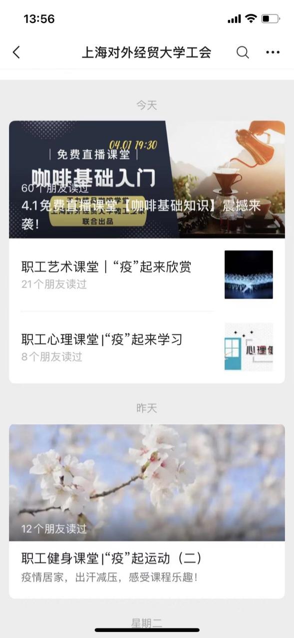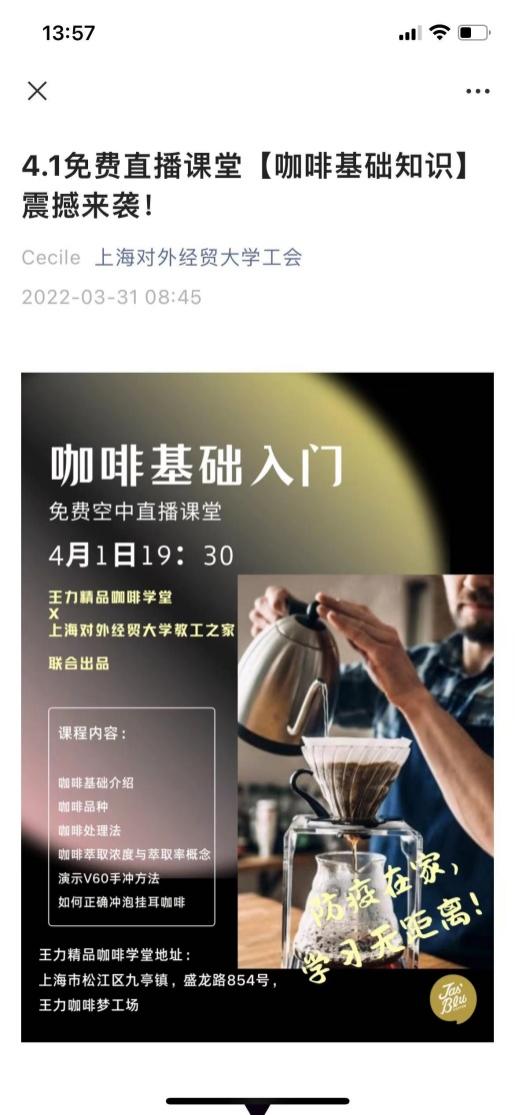 “互聯網+職工課堂”系列活動主要包含咖啡知識直播課、職工健身課堂、職工藝術課堂、職工心理課堂等模塊;課堂內容主要依托于各類官方網絡平臺,工會黨小組根據我校實際情況,通過對內容的整合、分類、梳理,精選具有正能量、適合我校教職工的課程內容。例如:咖啡知識直播課由工會教工之家聯合王力精品咖啡學堂推出,主要對咖啡品種、處理法、萃取、手沖方法等進行線上直播教學。職工健身課堂的內容主要由上海市總工會推出,邀請健身教練每天為教職工帶教種類豐富、簡單易學的居家健身課程。職工藝術課堂的內容是工會整合網上資源,集中推送,包括上海芭蕾舞團的芭蕾舞劇、上海藝術中心的話劇、上海音樂學院的音樂劇等高雅藝術劇目。職工心理課堂的內容主要由上海市總工會推出,邀請心理學“大咖”向教職工提供自我認知、壓力管理、情緒調解、積極心態、親子關系等知識培訓,幫助教職工提升自我心理調解的能力。
