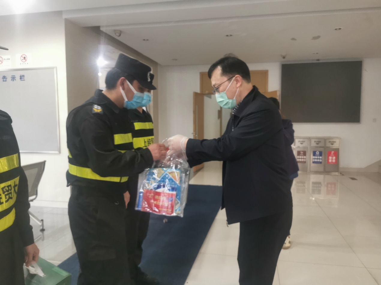 情系“疫”線,暖心關懷。學校啟動準封閉管理模式已有半月余,有一群最美SUIBE守護者逆向而行,堅守一線,沖鋒在前。他們保障著校園、社區安全有序的運行,體現了貿大人的責任與擔當。為感謝他們在疫情防控工作中的辛勤付出,同時保障他們的個人健康,校工會緊急采購慰問物資450份,包括維生素C、食品、牛奶和洗護用品,由校領導和學校辦人員先后將慰問品送到奮戰在松江校區、古北校區和松江社區抗疫一線的工作人員手里,把學校和工會組織的關心關愛送到了SUIBE守護者身邊。慰問品的采購、配送、發放過程也得到了學校辦公室、保衛處、后勤處等單位的大力支持,共同克服運能不足,協調車輛運輸,保障慰問品及時配送。