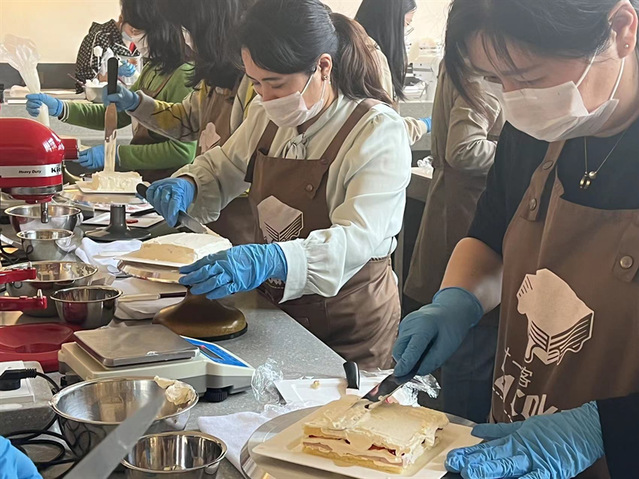 活動現場,21cake工廠的烘焙老師為大家詳細講解了蛋糕的制作過程,從面點到烘焙再到裱花,一步步教授大家如何制作出精美的蛋糕作品,期間還科普了動物奶油、植物奶油以及動植物混合奶油的區別。參與的女教職工們親自動手,握起裱花袋,創作出各種精美的蛋糕作品,充分展現了大家的創造力和想象力。
