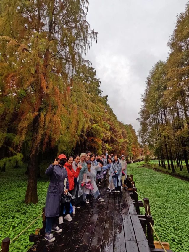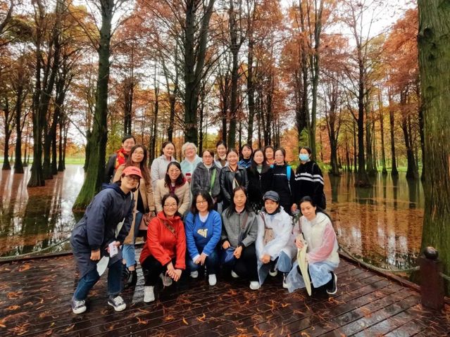 秋風(fēng)不語、落葉無聲,青西郊野公園是一個(gè)以濕地為特色的郊野公園,其中以遍布水上水杉而出名。十一月末、十二月初,這里的水杉由綠變紅,形成一道獨(dú)特的風(fēng)景線。游覽過程中,女教師們結(jié)伴而行,相談甚歡,彼此合影留念,記錄下這樣的美景與歡樂時(shí)刻。