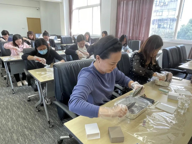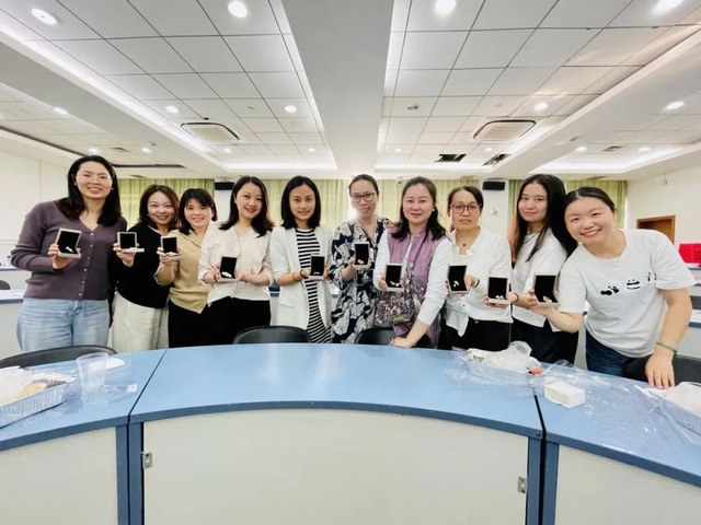 在活動中,女老師們開蚌尋珍,每個蚌的珍珠顏色、大小都是未知的,整個過程就像開盲盒一樣,驚喜而刺激。老師們開出珍珠后相互分享,面露喜色,整個現場充盈著歡聲笑語。隨后她們又對珍珠進行了細致的打磨、鉆孔和粘制,將每一枚獨特的珍珠變成了精致的胸針。這些胸針外形美觀,同時也因親手制作而被賦予了獨特的意義。她們互相分享著自己的作品和喜悅,交流著制作心得和技巧,現場氛圍十分熱烈。