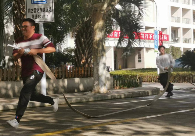 賽場上,裁判員發出口令,各教職工隊伍按照比賽順序一一進行消防技能競賽。現場參賽隊員奮勇爭先,嫻熟地甩水帶、接分水器、連接兩盤水帶和水槍,快速沖到終點,整個過程一氣呵成。