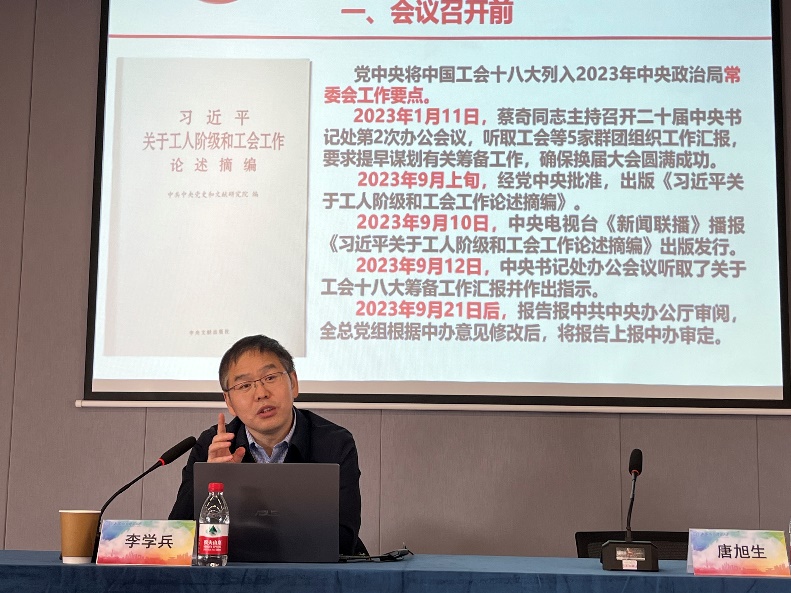 在講座中,李學兵老師圍繞著學習貫徹中共工會十八大精神展開演講,從工會是什么、工會從哪里來以及工會未來要怎么發展這三個方面進行了具體闡述。李學兵老師通過引用習近平總書記同全國總工會第十八屆領導班子成員集體談話時的重要講話,強調學習貫徹黨的工會方針政策的重要性,并為如何進一步加強工會組織改革創新、服務職工群眾、促進勞動關系和諧穩定提供建議。