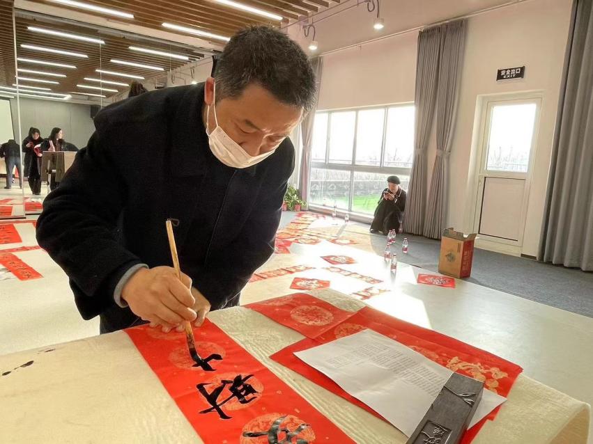 活動中,書畫協(xié)會的老師們神情專注,熱情洋溢地在鮮紅的春聯(lián)紙上揮毫潑墨,一停頓、一落筆、一張張紅紙、一句句祝福,散發(fā)著清新墨香的春聯(lián)融入了喜慶和熱情,帶著對美好節(jié)日的憧憬,為即將到來的新年增添喜氣。