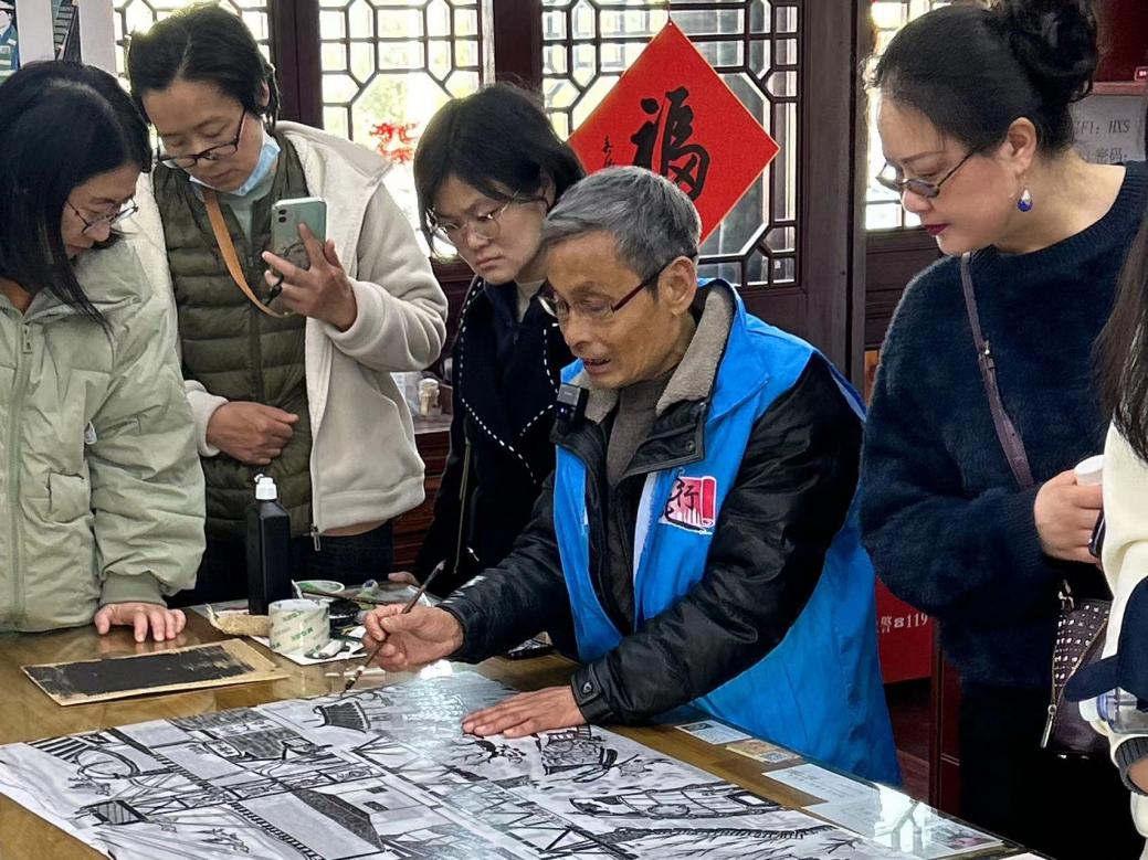 在講解員的帶領下,教職工參觀了位于松江古城東門外的華陽老街的車墩鎮非遺傳承中心,傳承中心依水臨街,具有明清江南水鄉傳統建筑風格。體驗活動通過版畫、剪紙作品傳遞紅色精神,教職工們積極參與了版畫制作體驗,通過學習版畫歷史與制作工藝,近距離感受濃厚豐富的紅色文化底蘊。