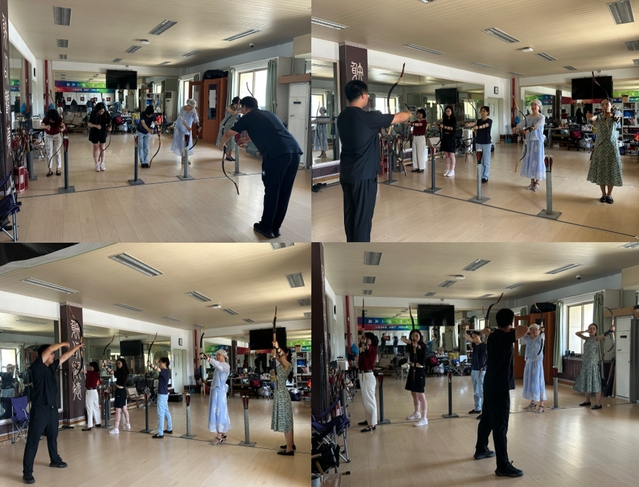在傳統射藝課上,老師們先是認真聆聽了教練關于射藝的禮儀介紹,而后在其專業指導下認真學習拉弓、瞄準、放箭的動作要領。起初雖略顯生疏,但在不斷嘗試與練習中,老師們逐漸掌握了技巧,讓他們深刻體會到射藝不僅是技藝的傳承,更是對專注、禮儀與自我修養的磨礪。