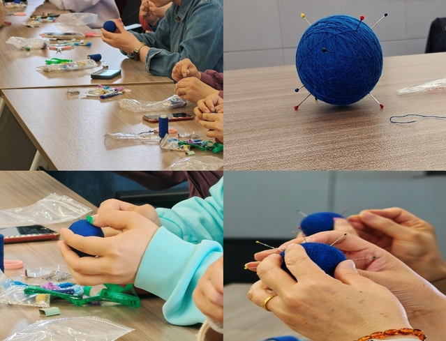 在手鞠球技藝的課堂上,指導老師詳細闡述了手鞠球起源于唐代的悠久歷史背景及其所蘊含的美好寓意,并對教職工進行了纏繞、分球、刺繡等基礎技藝的指導。老師們通過彩線纏繞制作出精致的圖案,體驗到了指尖藝術的美感。該活動不僅提高了參與者的實踐技能,還使他們得以近距離感受非物質文化遺產的獨特魅力,從而豐富了文化生活的內容。