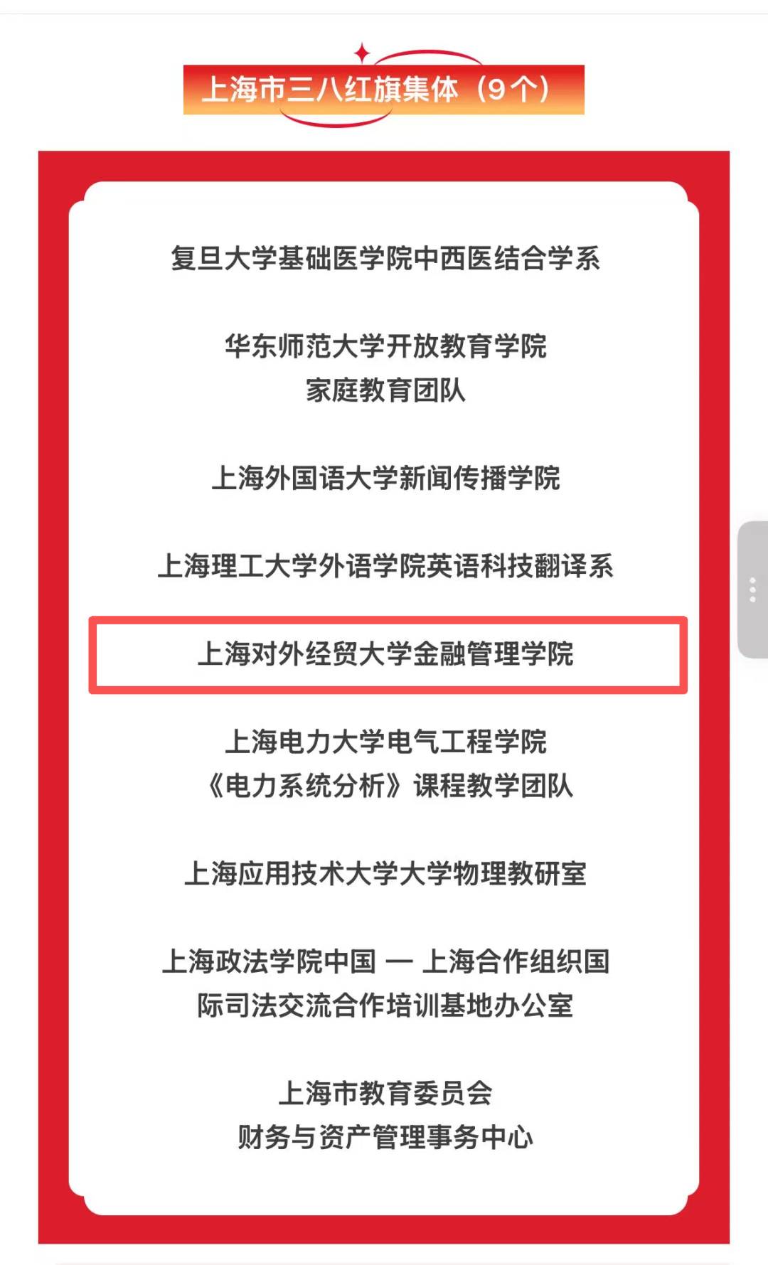 近日,2022—2024年度上海市三八紅旗手(集體)名單正式揭曉!我校金融管理學院榮獲2022-2024年度上海市三八紅旗集體。